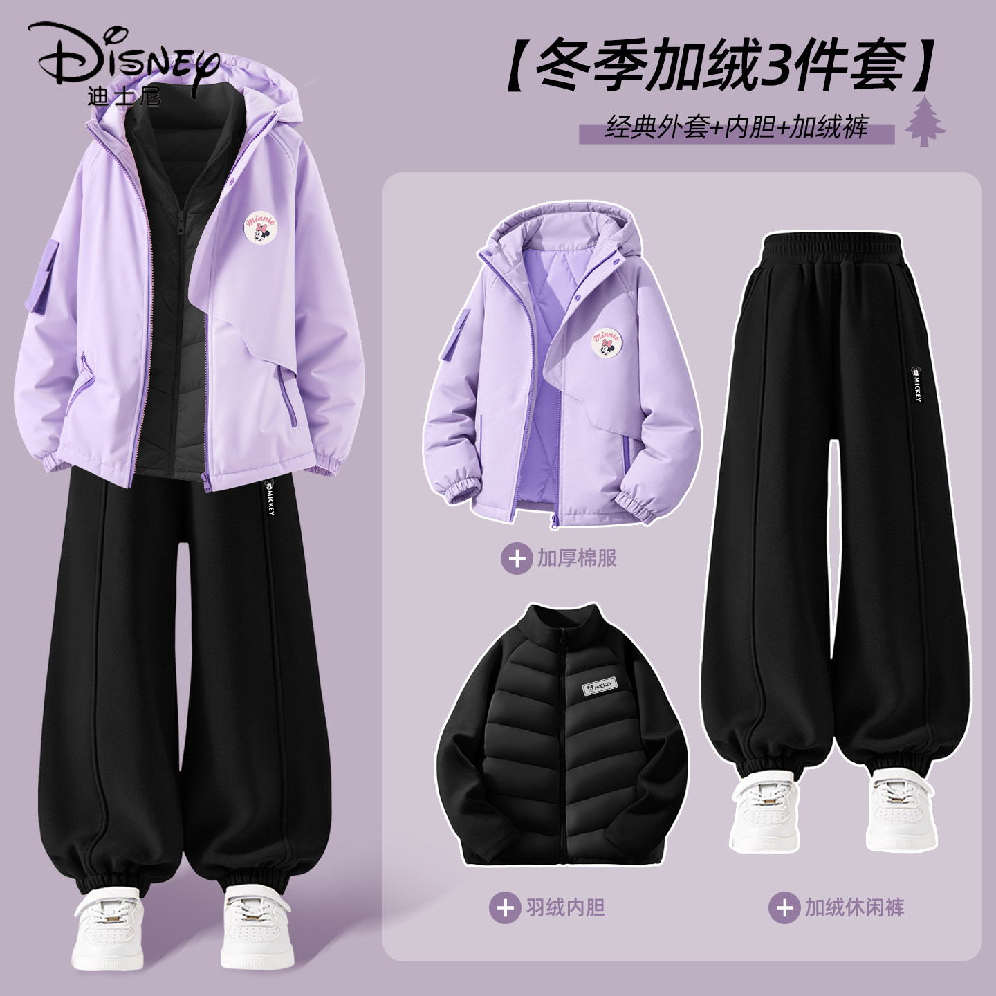 迪士尼女童冬装套装2026新款中大童紫色加厚保暖棉服外套儿童冬装