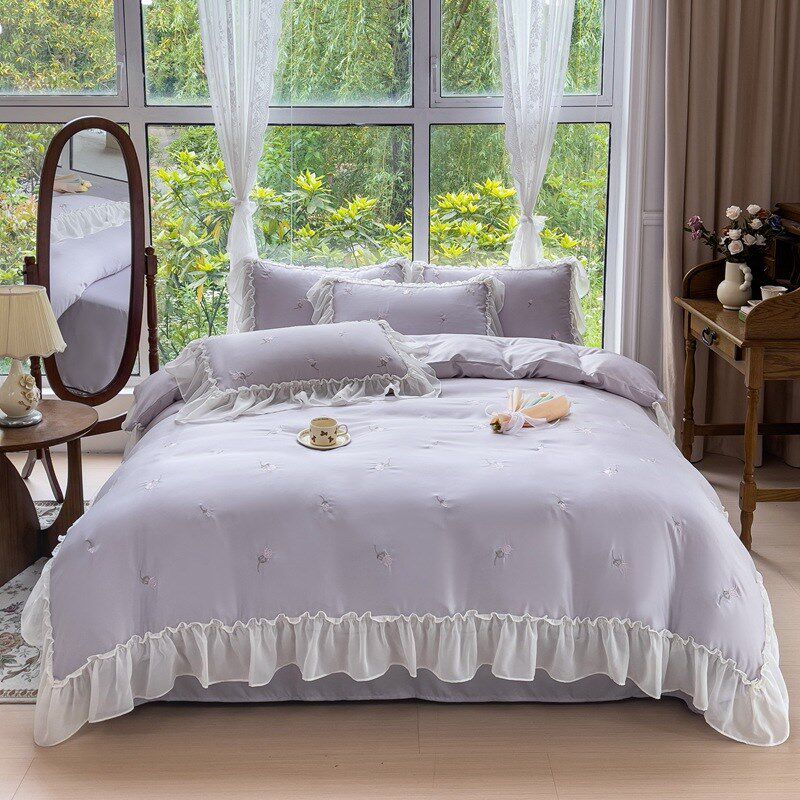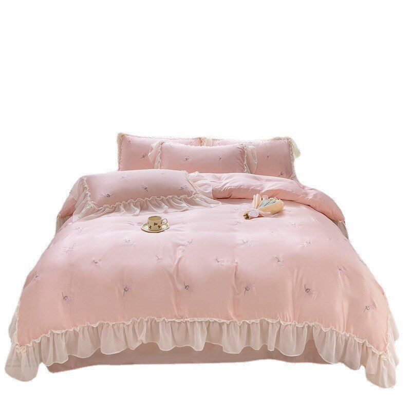 法式白色冰丝床上四件套奶油公主风被套床单水洗真丝蕾丝边夏季
