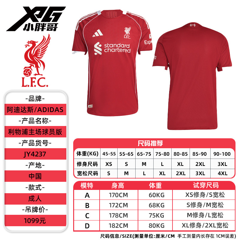 小胖哥XPG阿迪达斯25-26利物浦主场球员版球衣比赛训练短袖足球服