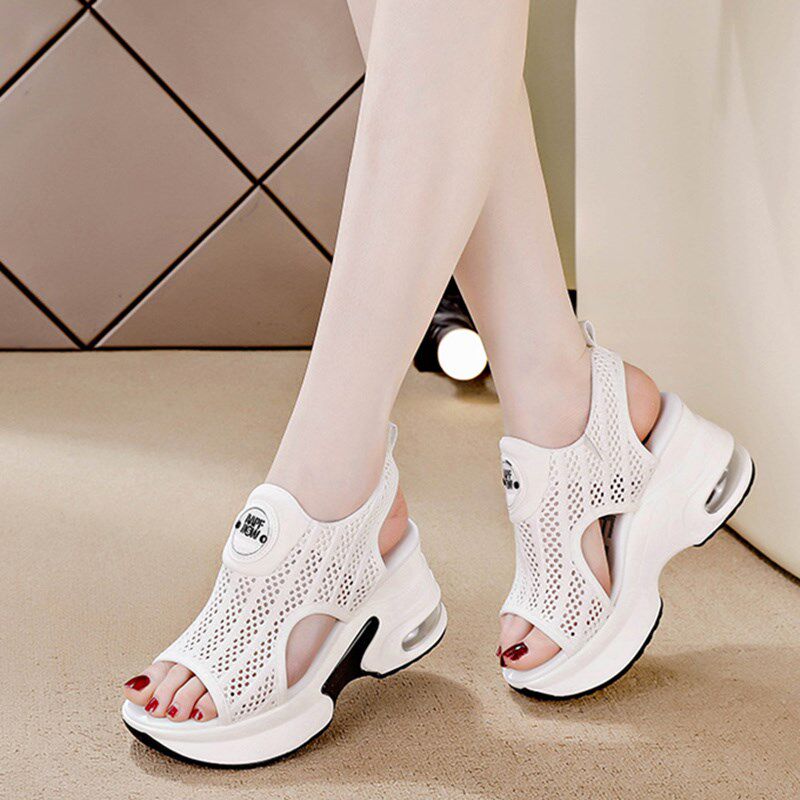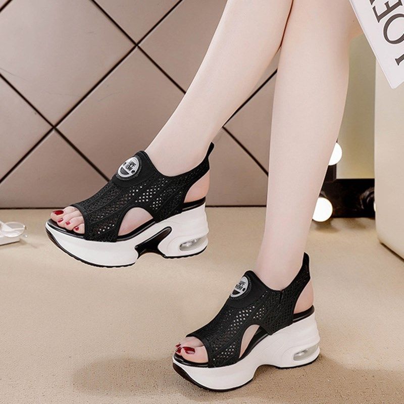 鱼嘴凉鞋女夏季2025新款小个子内增高女鞋8cm坡跟休闲旅游鞋网鞋