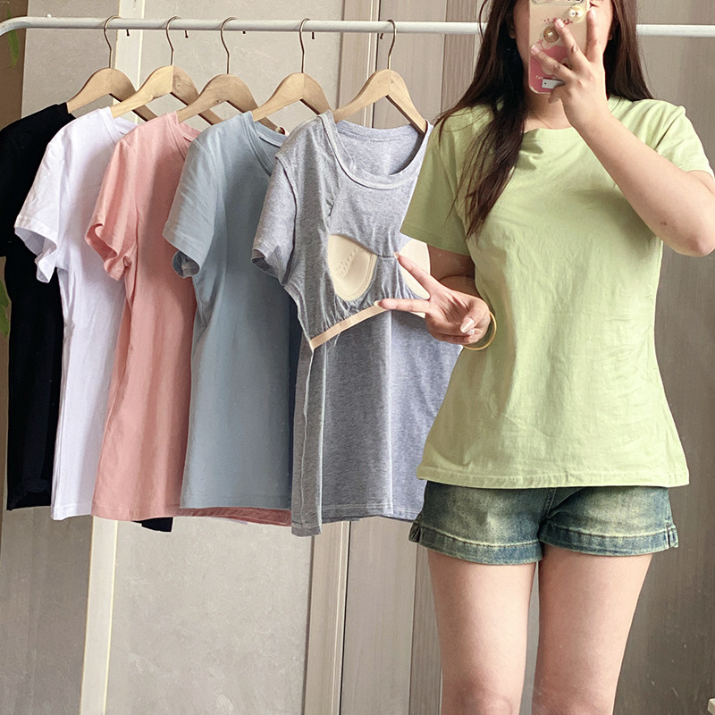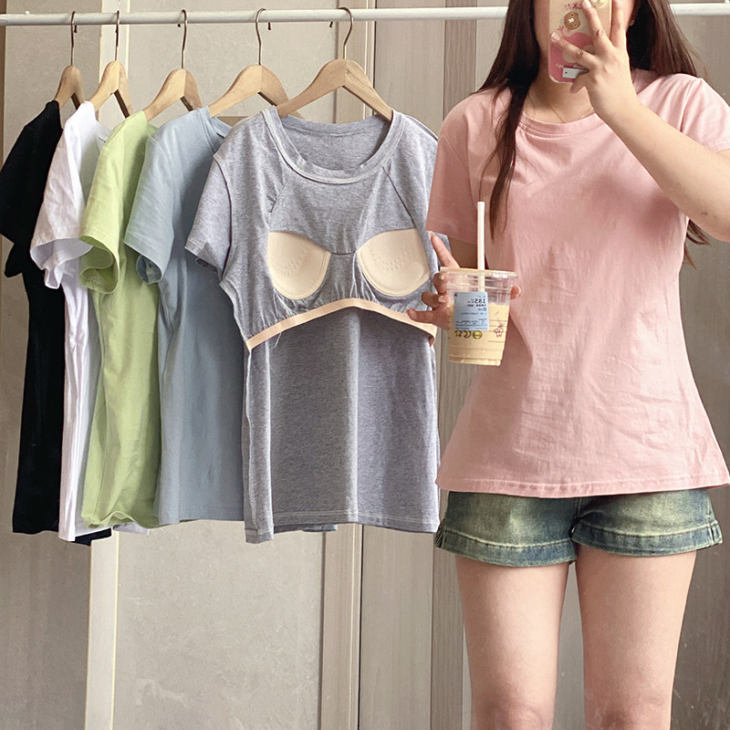 纯棉睡衣单上衣女带胸垫t恤夏季短袖宽松显瘦纯色瑜伽外穿家居服
