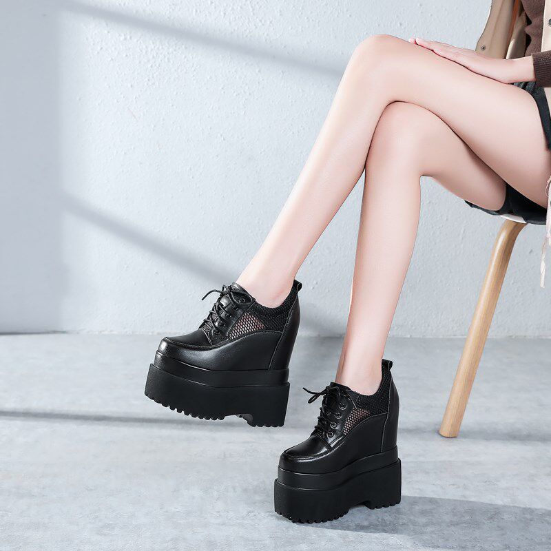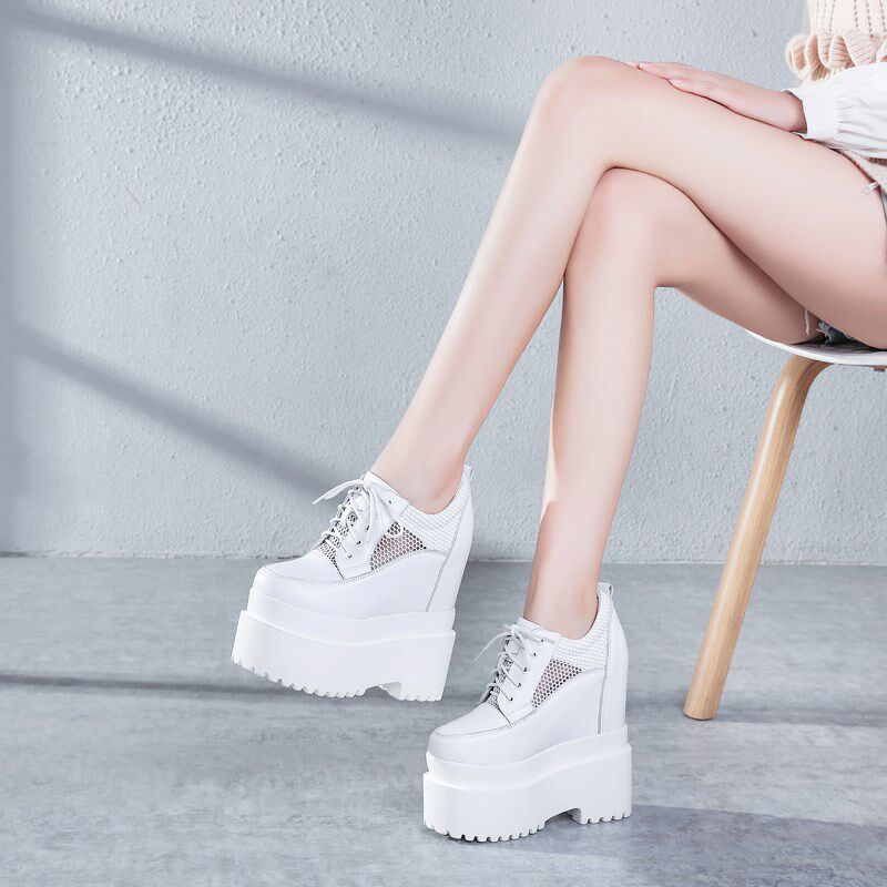 16CM超厚底内增高女鞋超高跟坡跟单鞋真皮网面小白鞋恨天高松糕鞋
