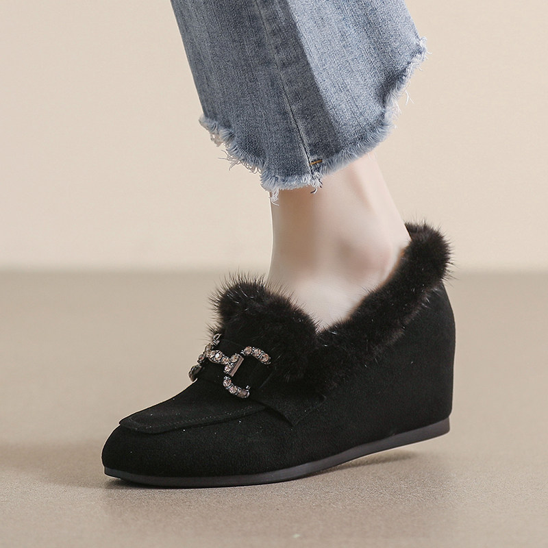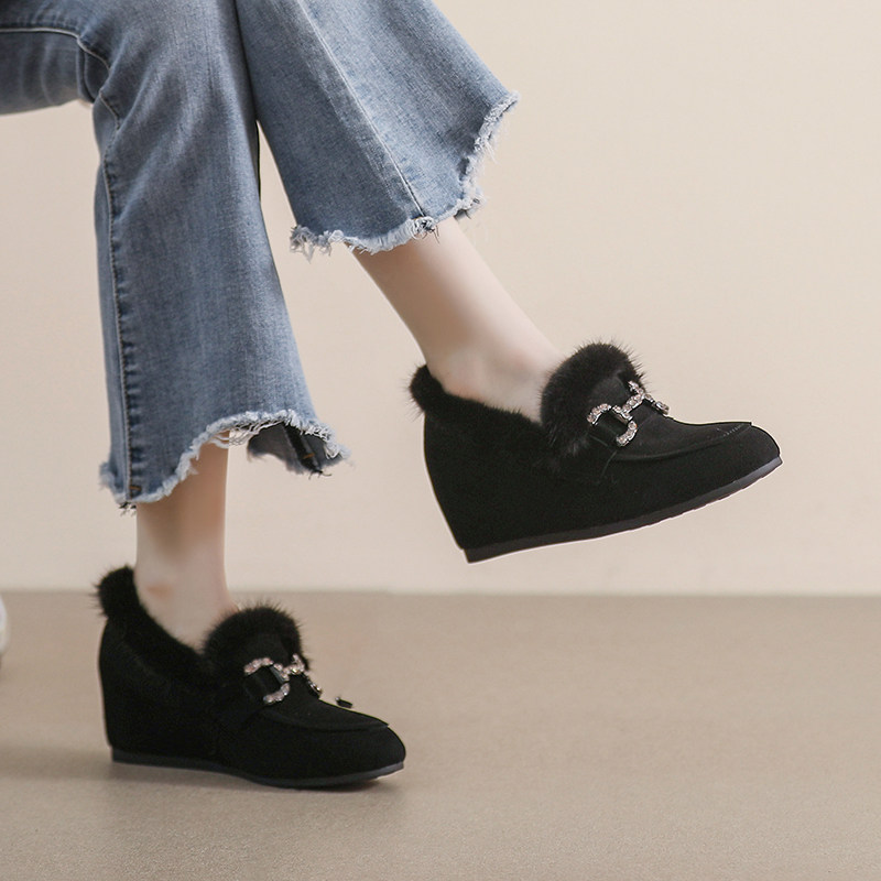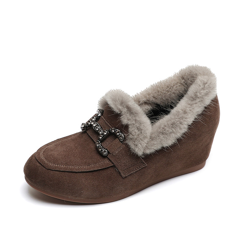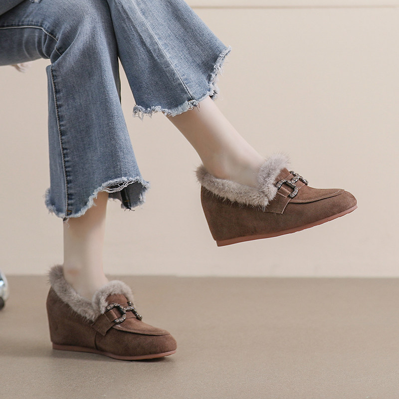毛毛鞋秋冬外穿2025新款真皮鞋子一脚蹬内增高加绒豆豆鞋坡跟棉鞋