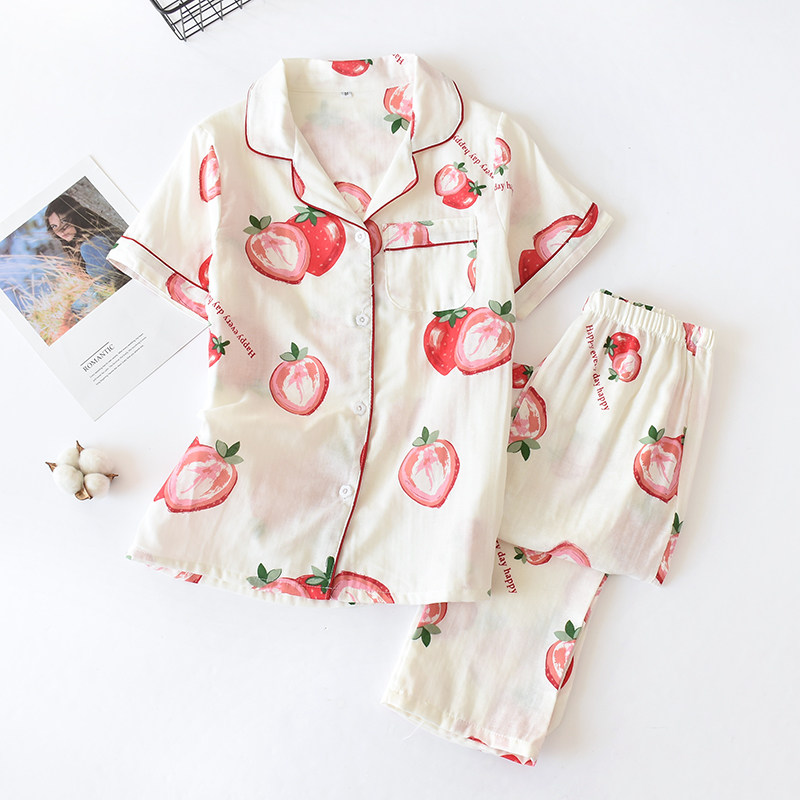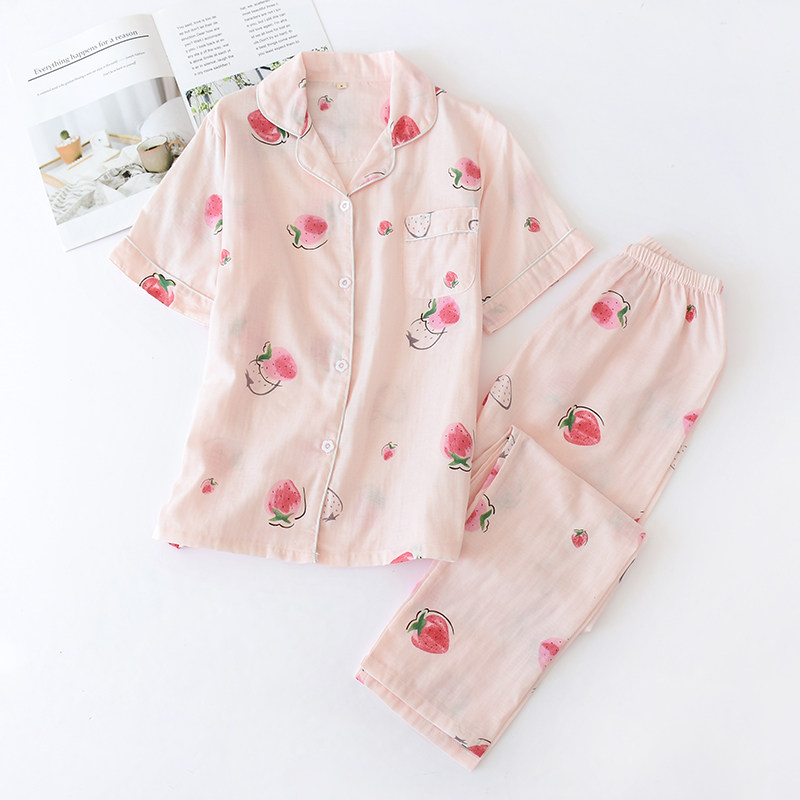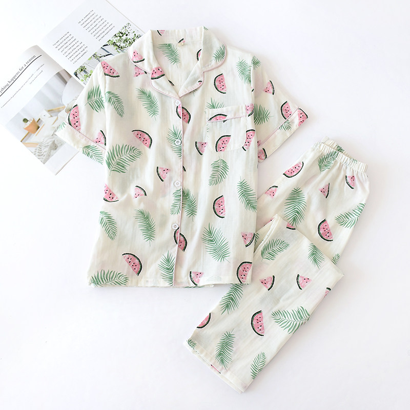 睡衣女款夏季纯棉纱布短袖长裤套装可爱卡通清新学生家居服两件套