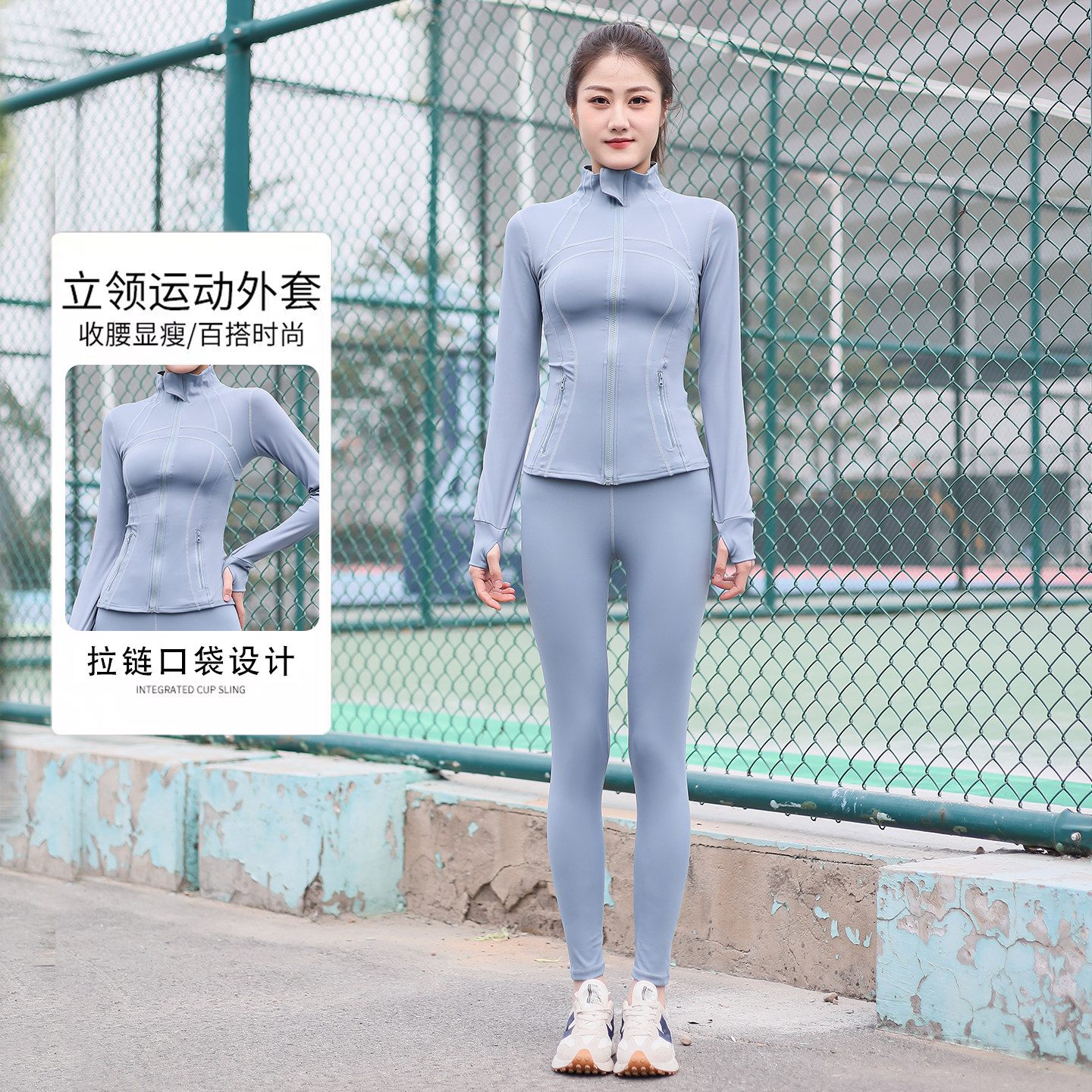 粉色修身运动服套装女2026新款高级感立领拉链长袖口袋瑜伽健身服