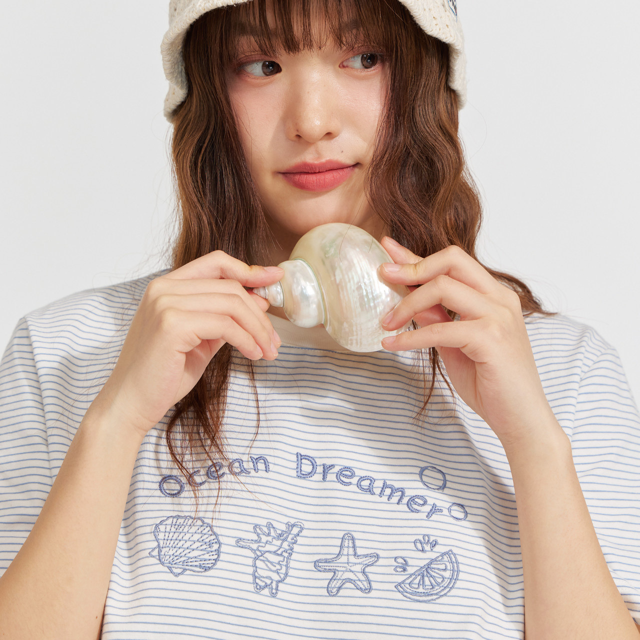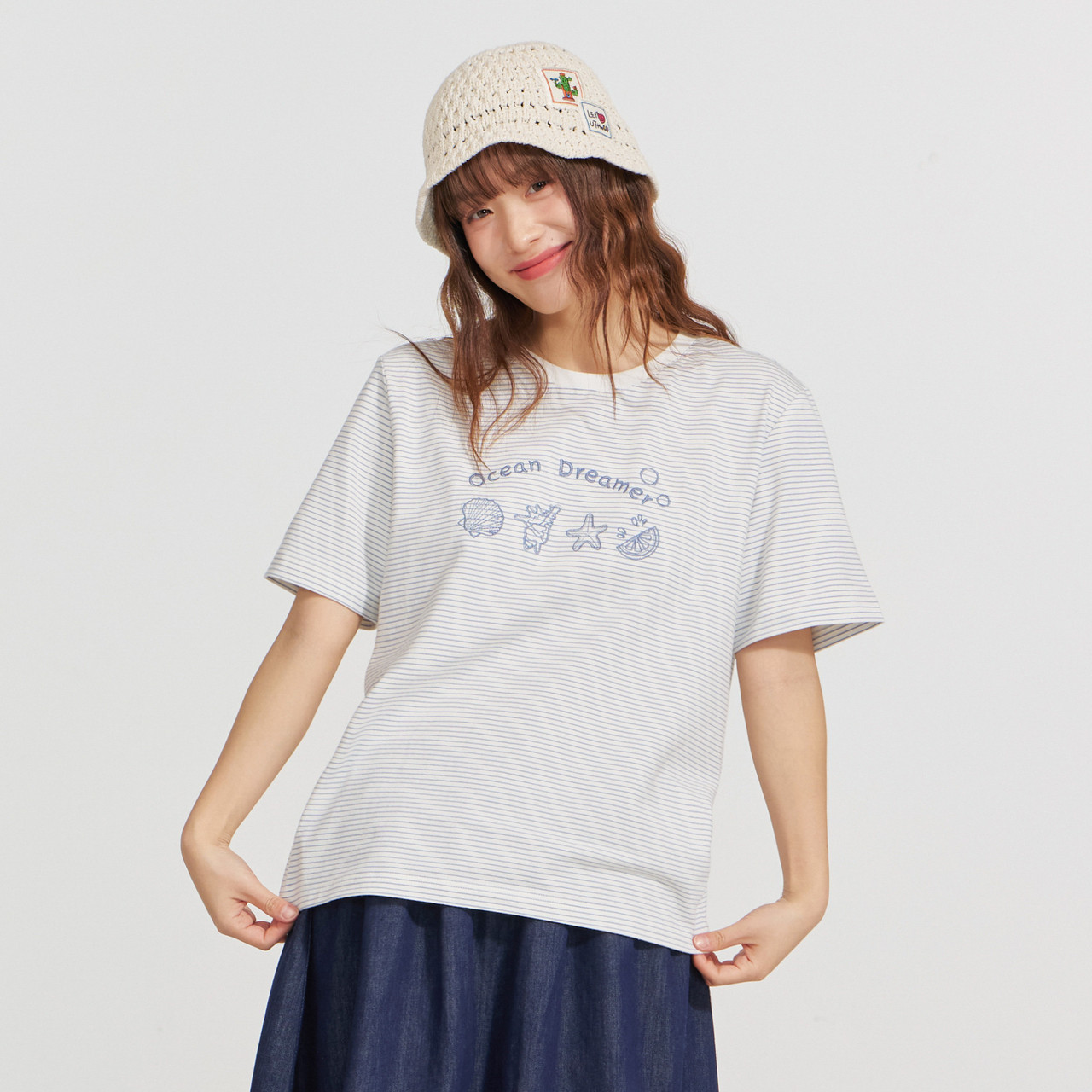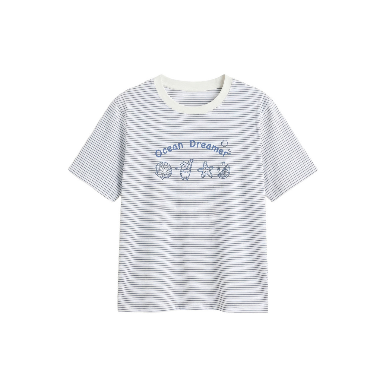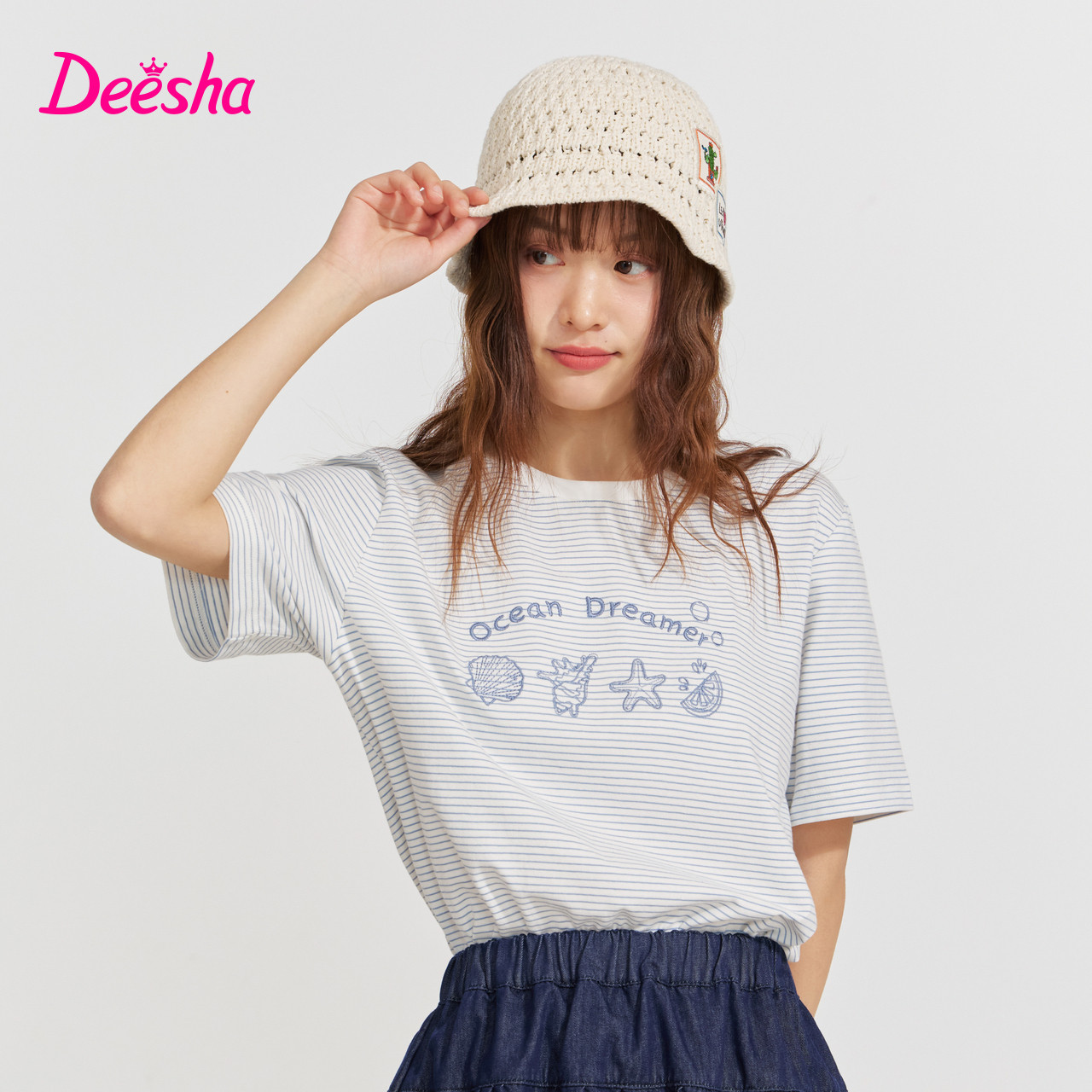 笛莎童装女童短袖T恤夏季新款青少年大童儿童初中生条纹刺绣上衣