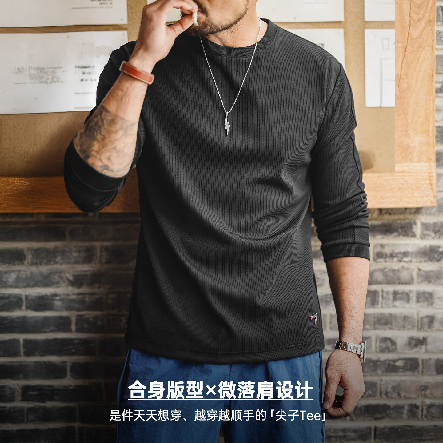 马登工装美式3D坑条长袖T恤白色打底外穿薄款针织无帽卫衣男款春