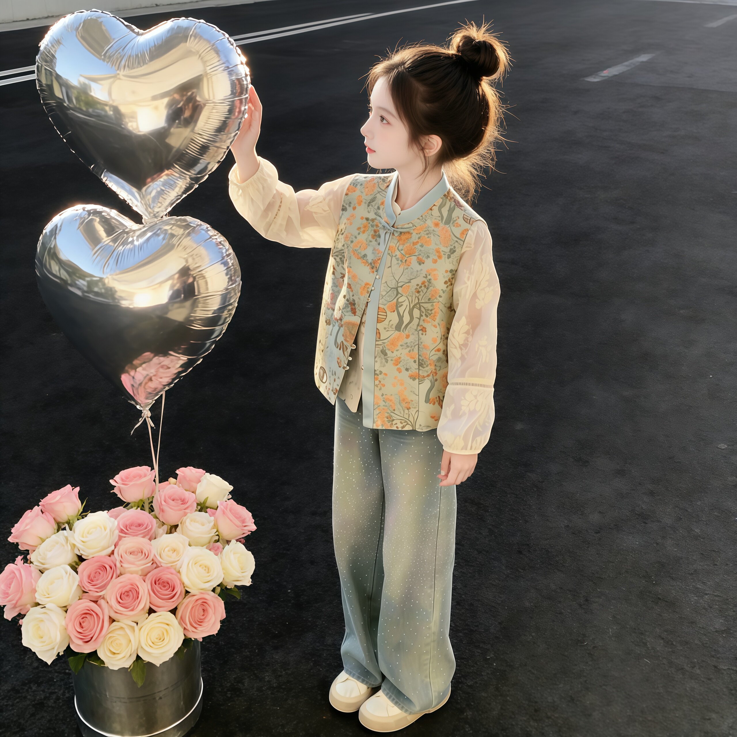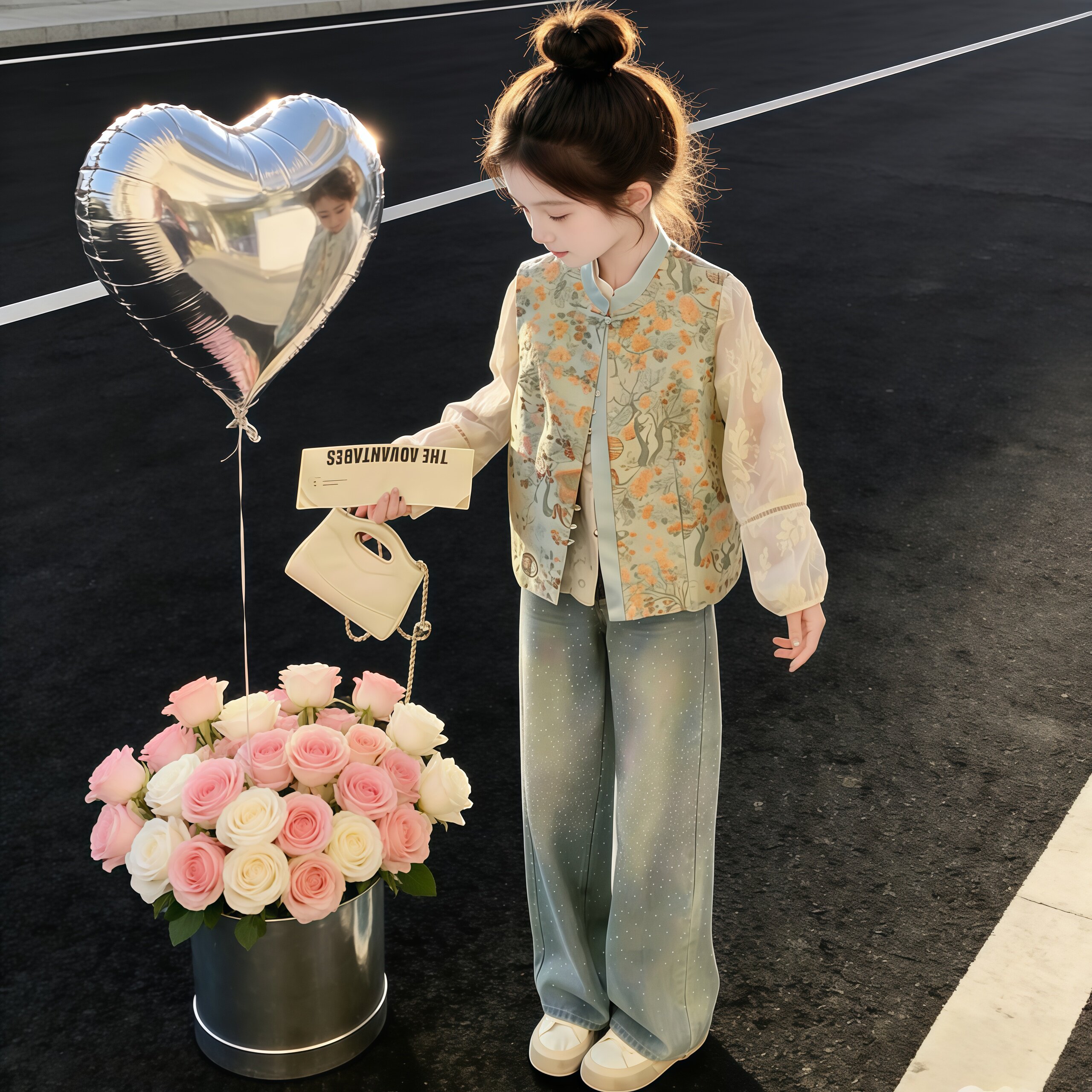 女童2026新款国风套装春季新中式气质复古马甲衬衫牛仔套装中大童