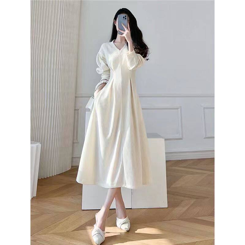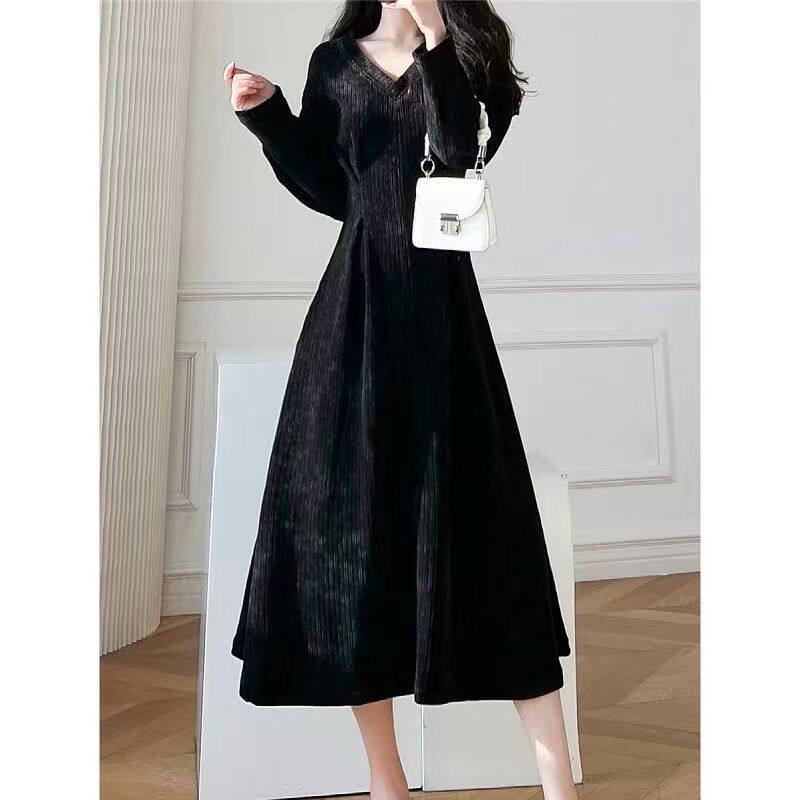法式茶歇V领长袖连衣裙女春秋配大衣的内搭气质高级感冬款长裙子