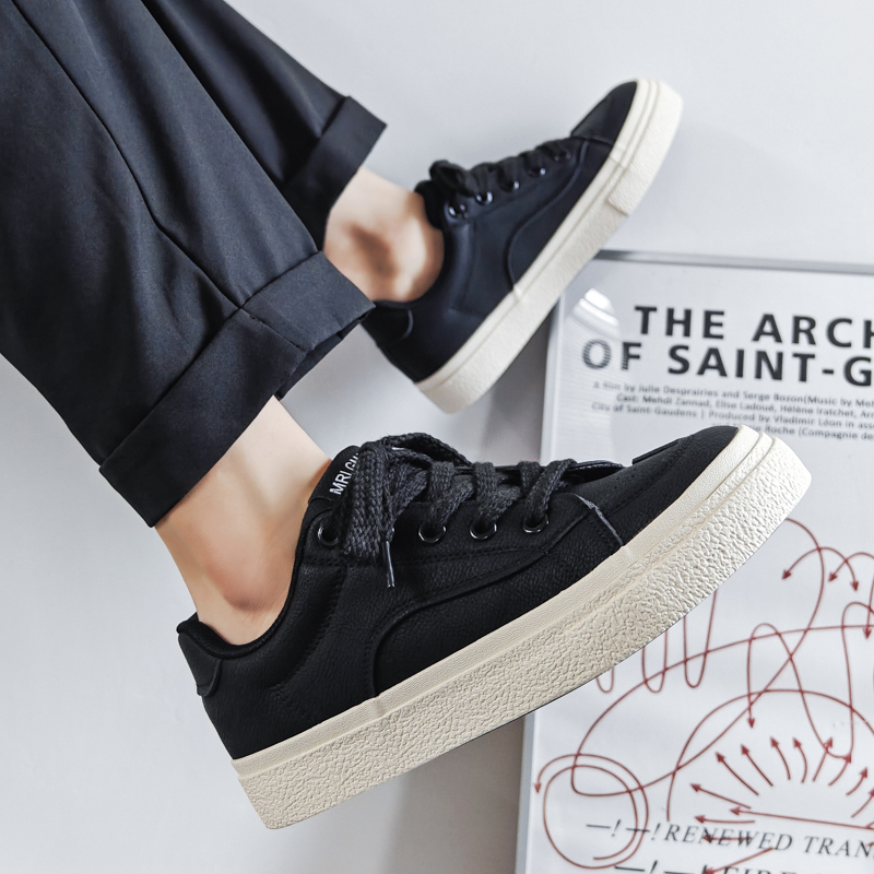 2026春季新款平底板鞋男款透气鞋子男潮鞋百搭男士黑色皮面休闲鞋