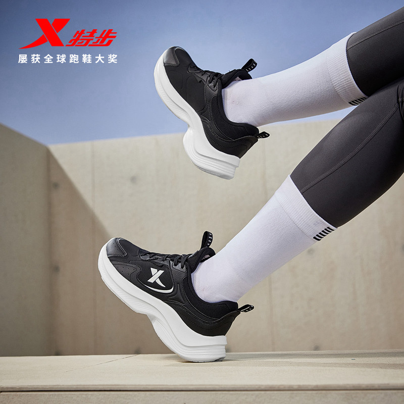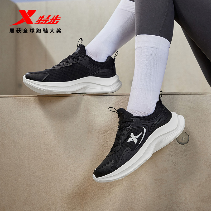 特步女鞋官方旗舰轻便软底黑色运动鞋女款妈妈皮面防水健身跑步鞋