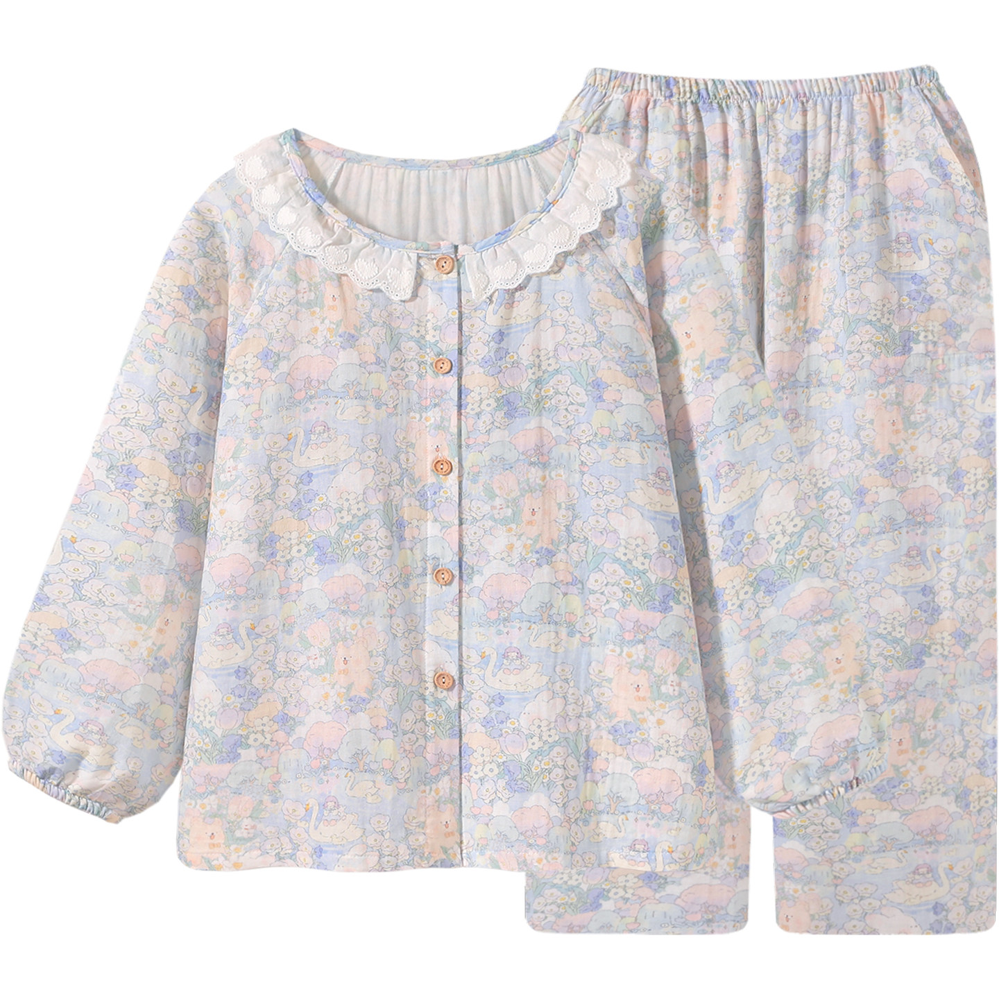 『小熊天鹅湖』卡通绝美睡衣女款春秋冬纯棉纱布可外穿家居服套装