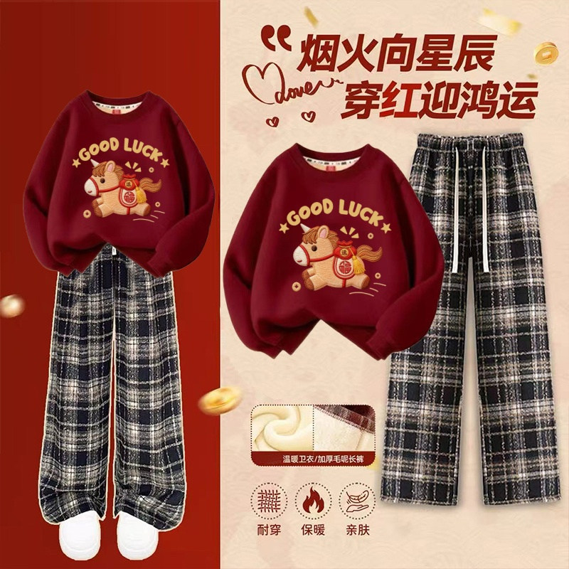 女童加绒红色卫衣冬装套装2026马年新款今年流行爆款中大童过年服
