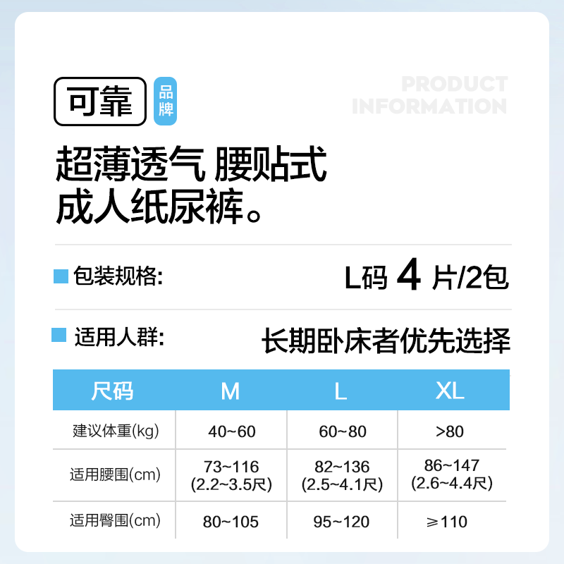 【天猫U先】可靠成人纸尿裤老人用尿不湿超薄透气L码试用装4片装