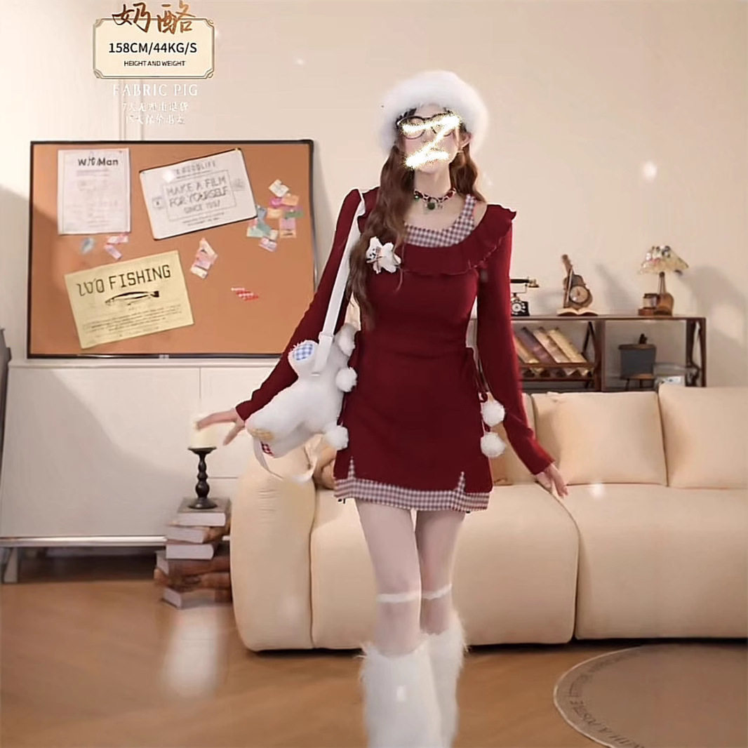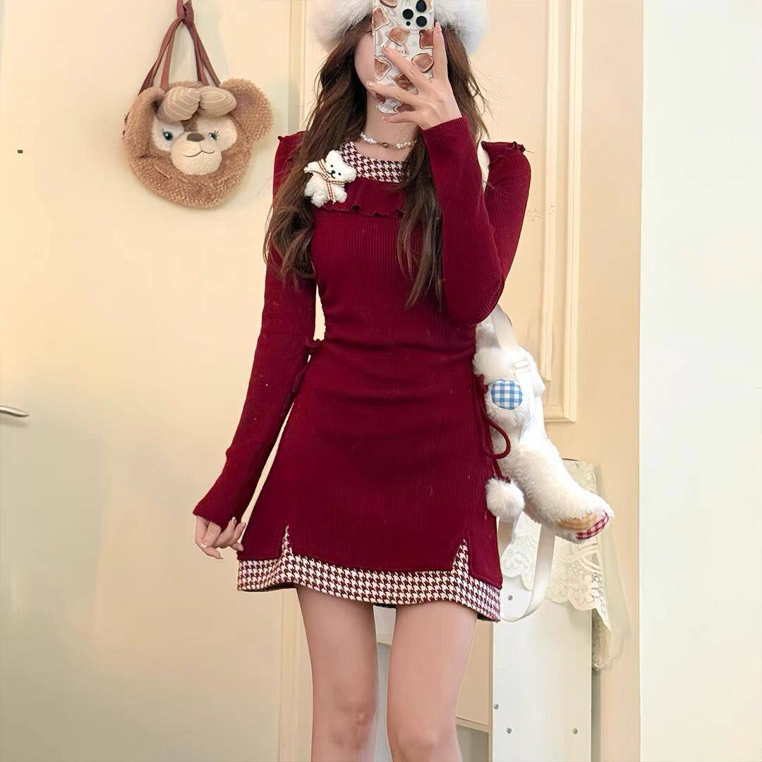 辣妹圣诞红色格子荷叶连衣裙长袖针织冬季新款收腰显瘦短裙裙子