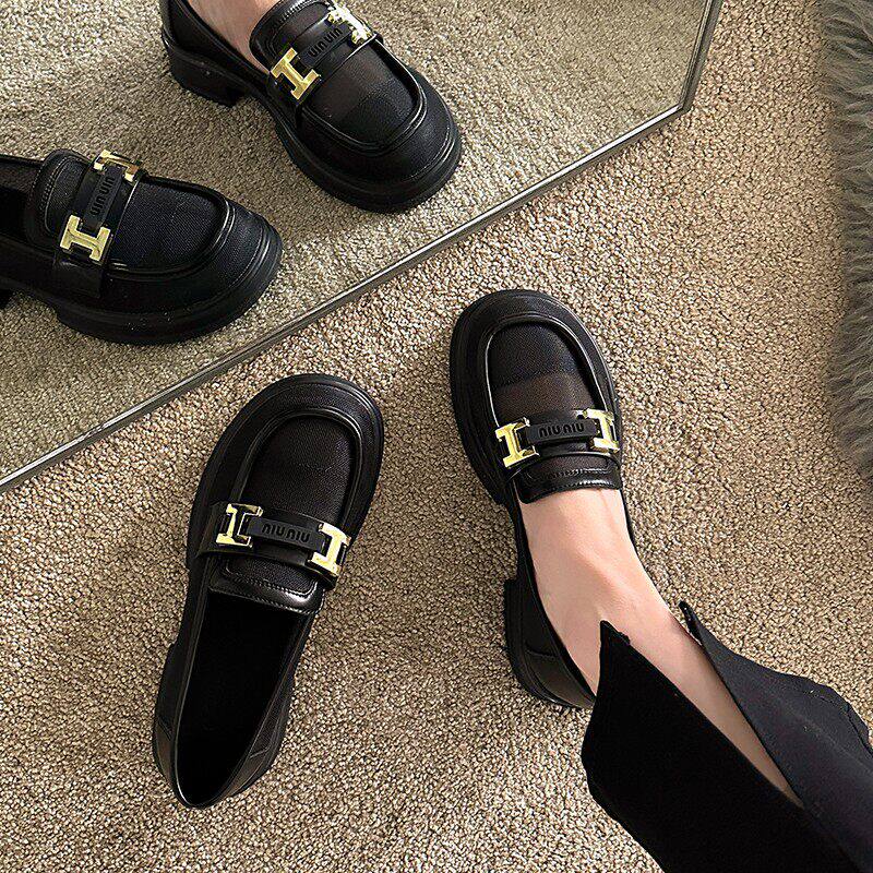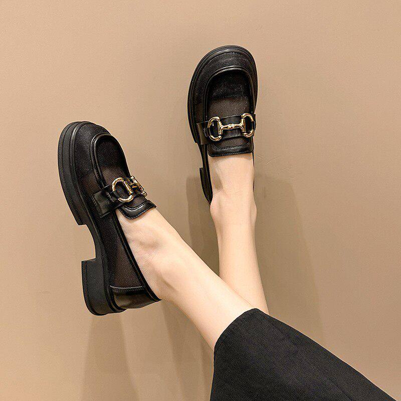 网纱乐福鞋女2025春夏新款透气单鞋一脚蹬镂空小皮鞋薄款黑色上班