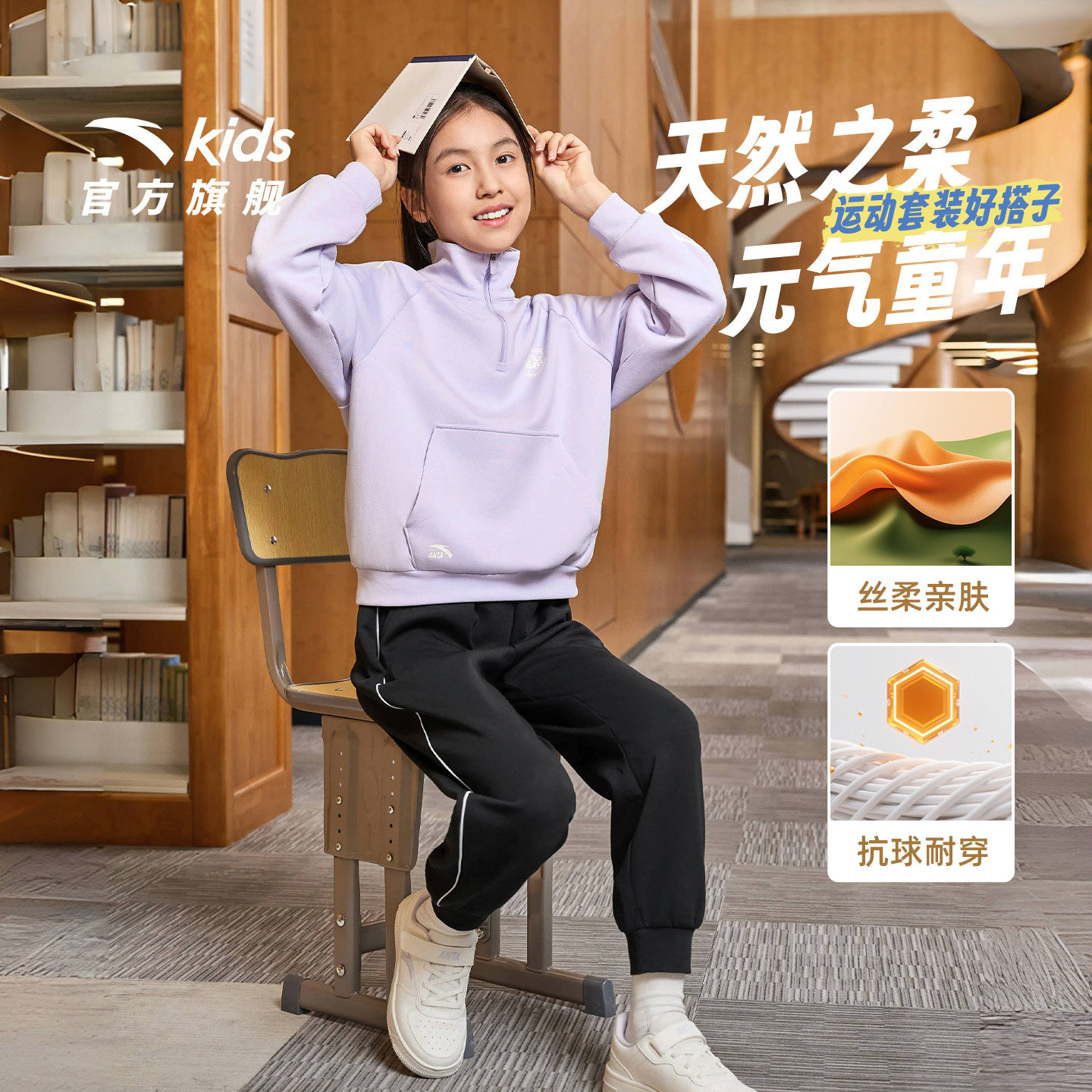 安踏儿童套装女童套装2025秋冬亲肤中大童卫衣外套裤子两件套