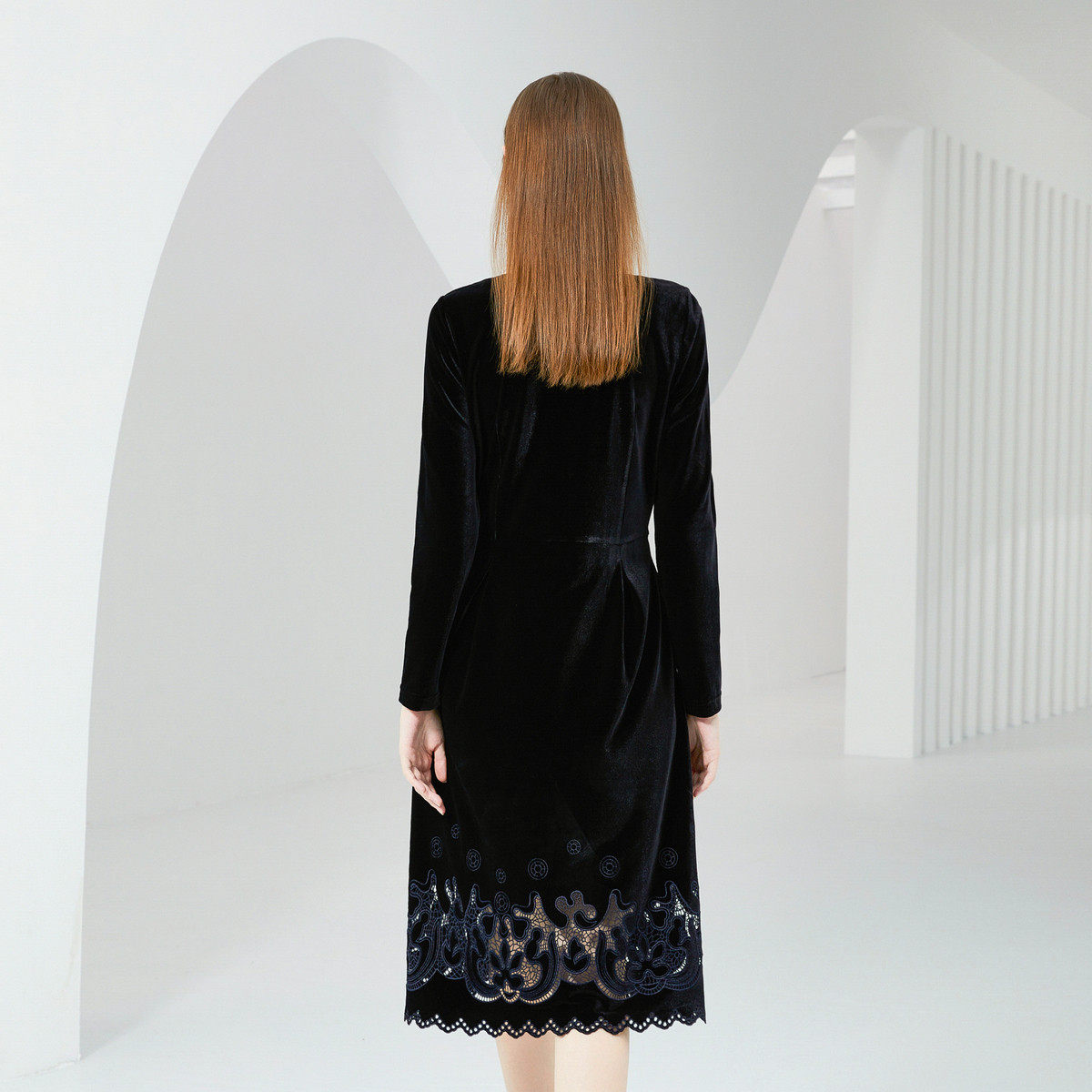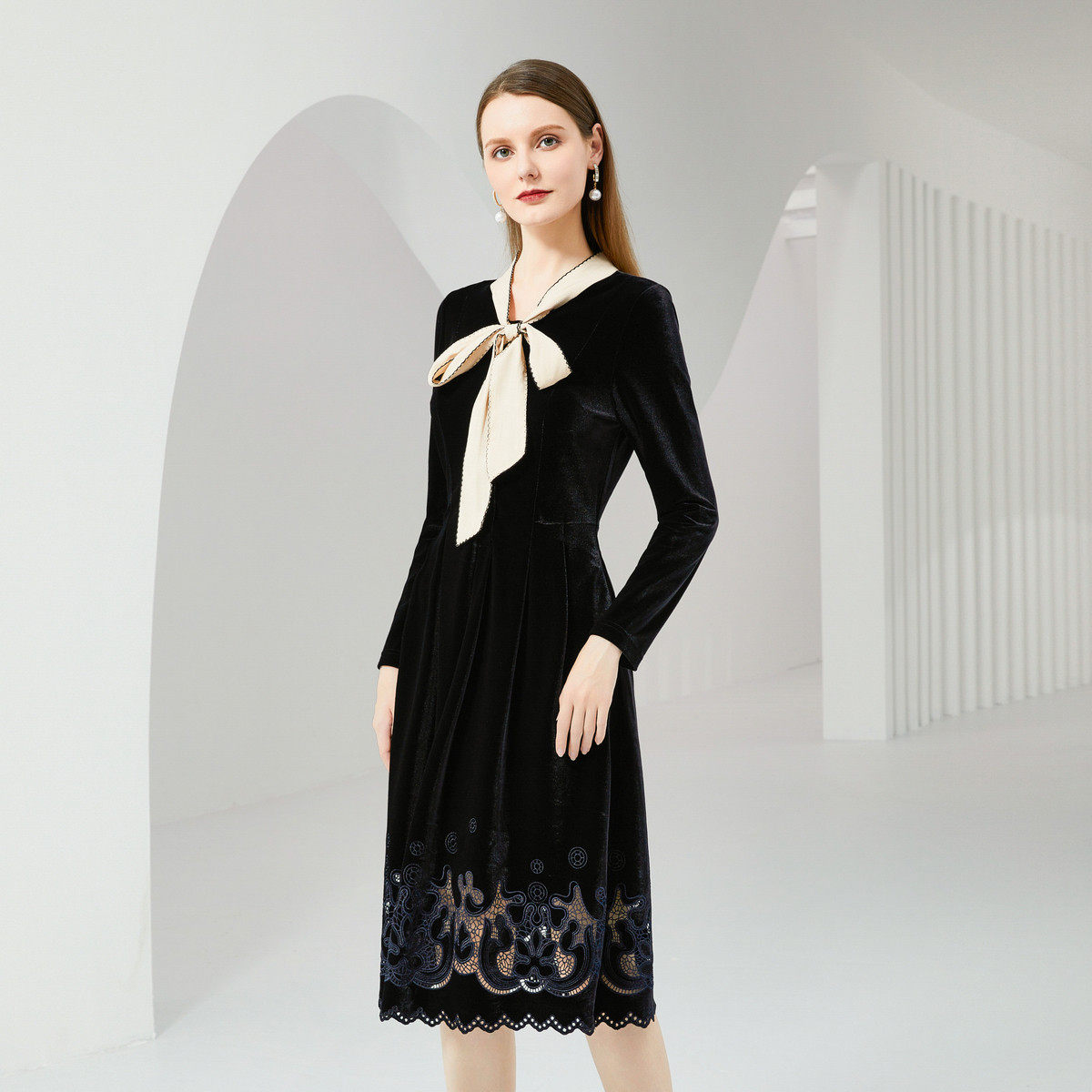 马天奴女春秋新款黑色系带领丝绒连衣裙长袖收腰长裙气质洋气裙子