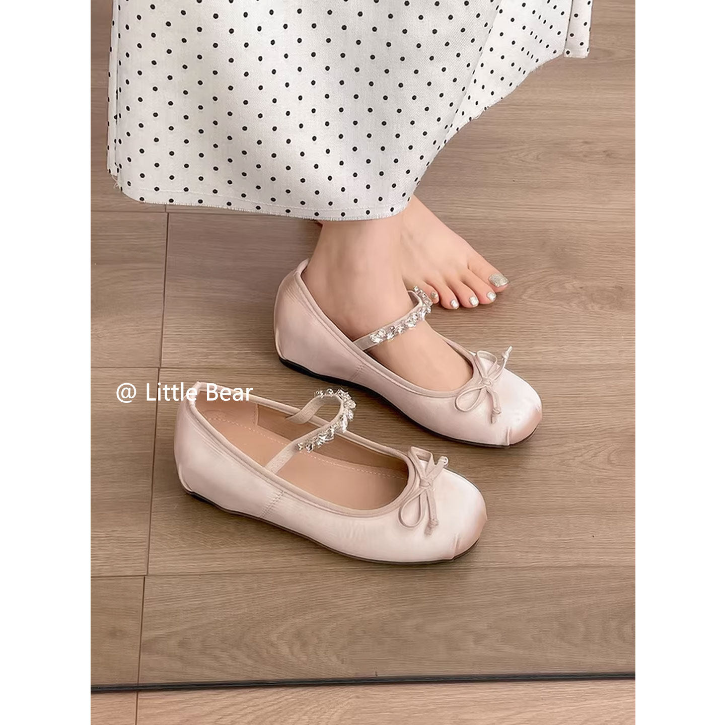 小熊出走水钻蝴蝶结内增高玛丽珍单鞋女圆头银色法式芭蕾舞鞋