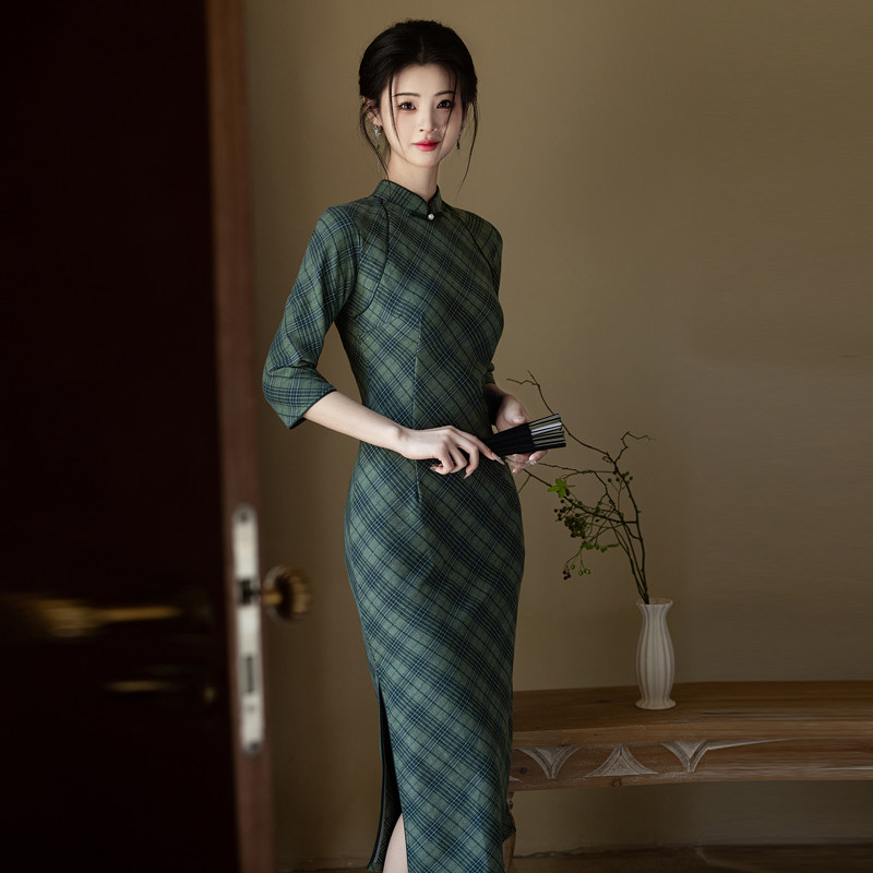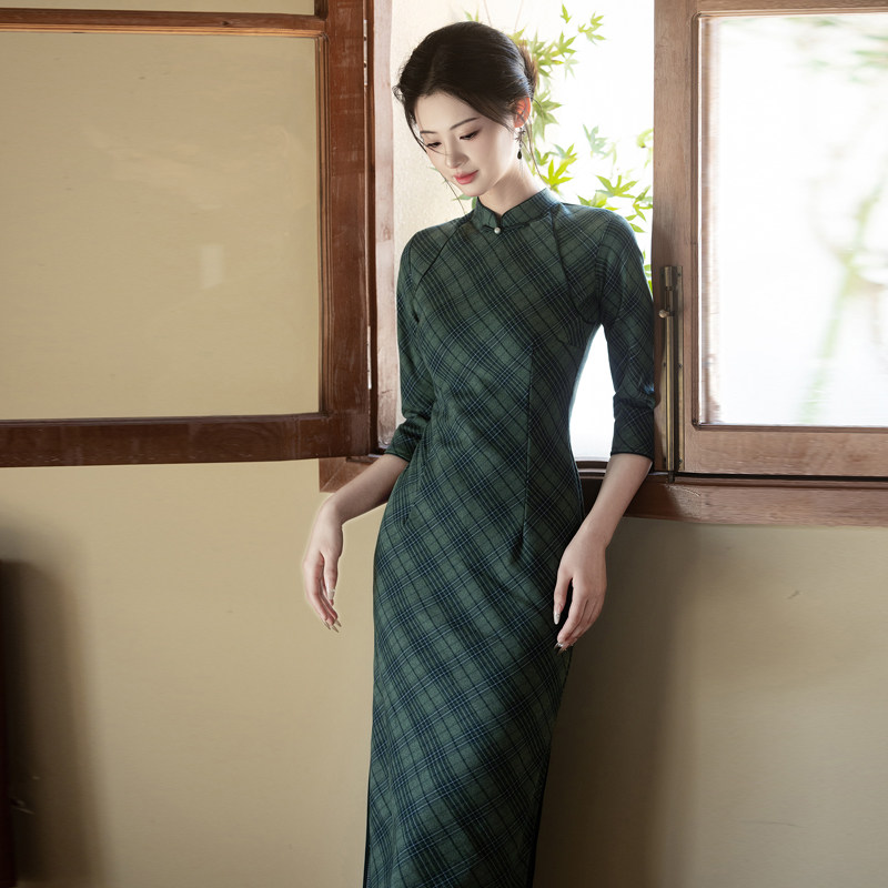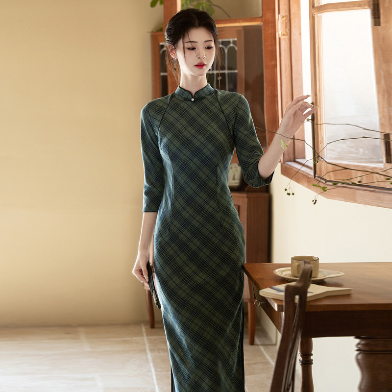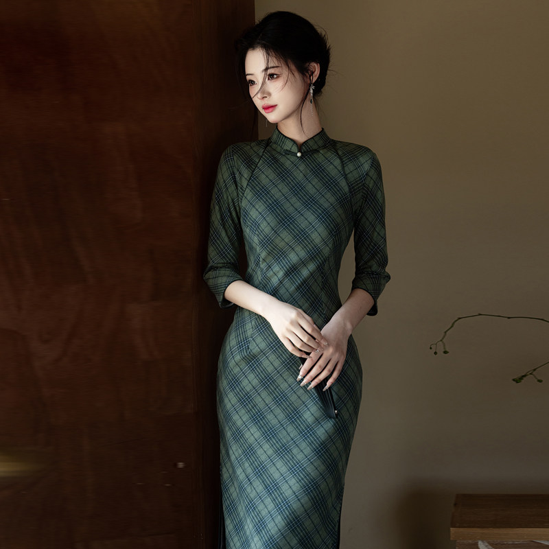 文艺复古民国风长袖格子旗袍2026春季新款年轻款少女长款连衣裙