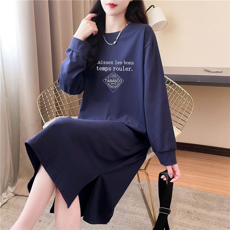 纯棉长袖连衣裙女秋季中长款过膝宽松开叉套头懒人家居睡衣t恤裙
