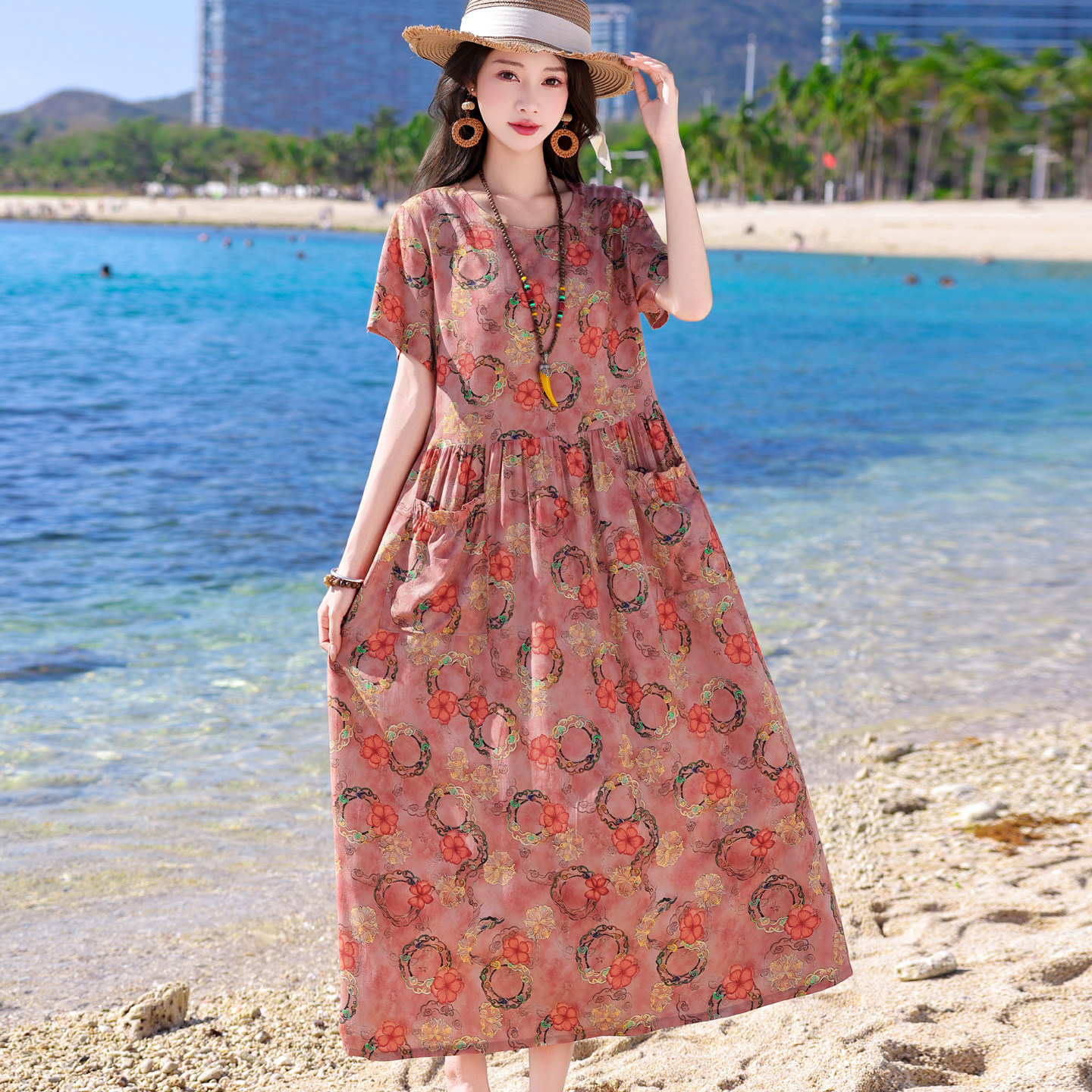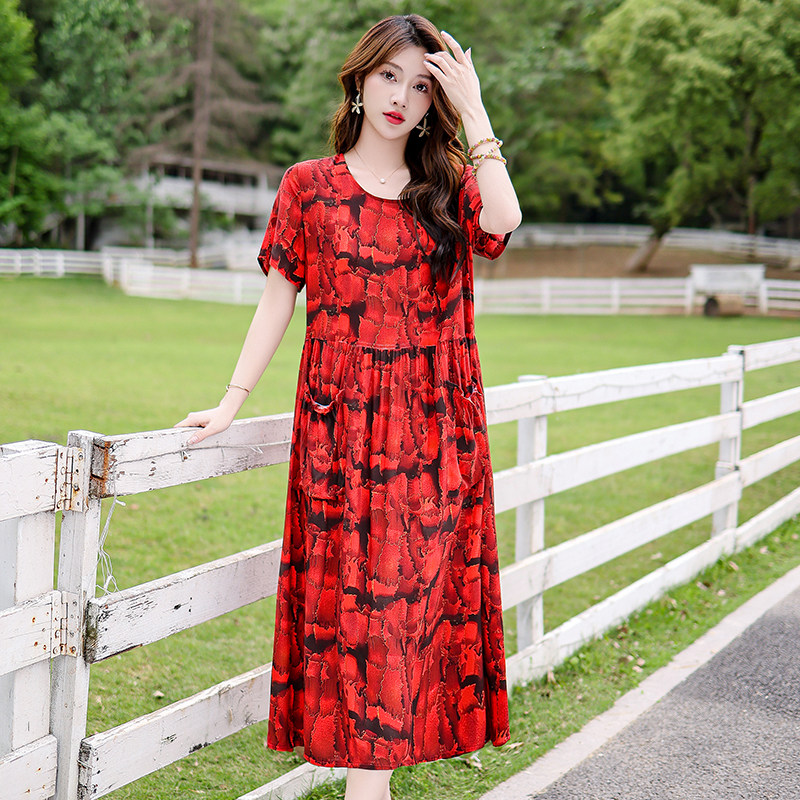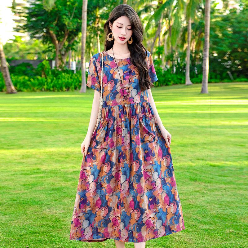 度假风棉绸印花连衣裙女短袖夏季宽松显瘦中老年妈妈长裙高端显瘦