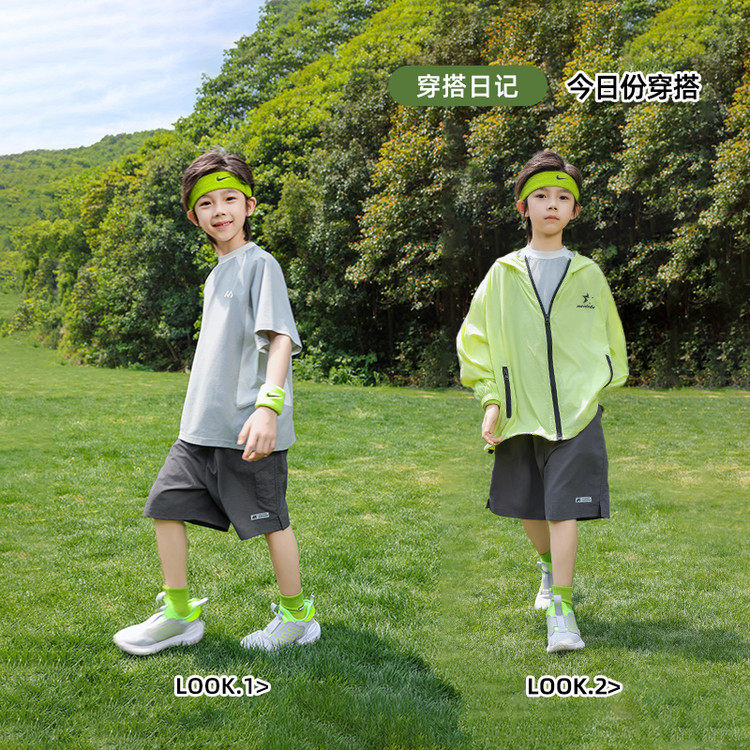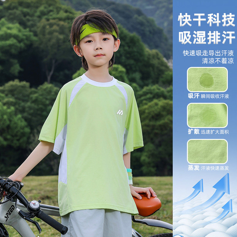 2026运动穿搭圆领速干T恤男童荧光绿拼接短袖宽松户外夏季薄款