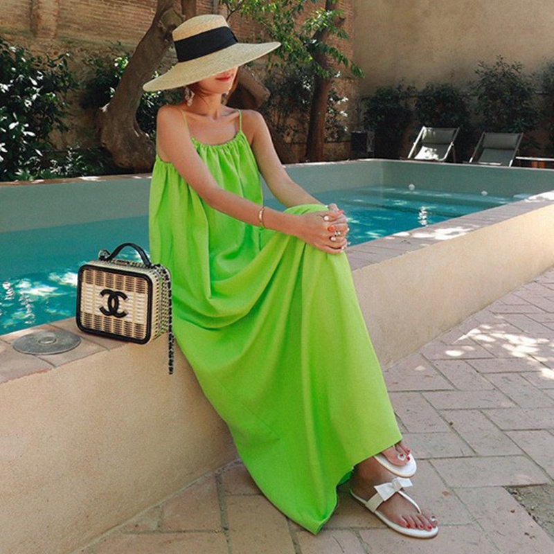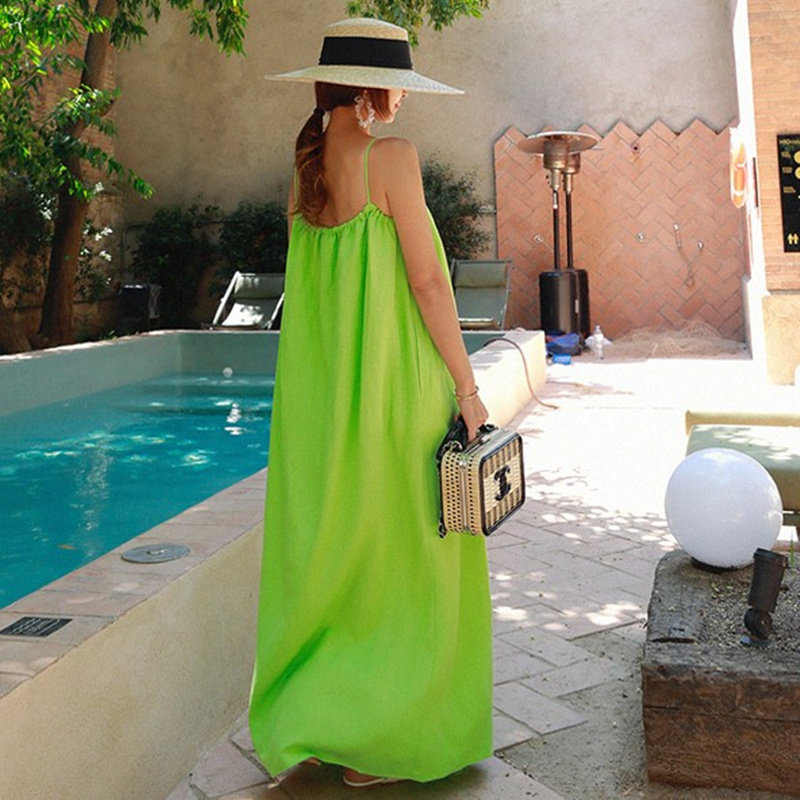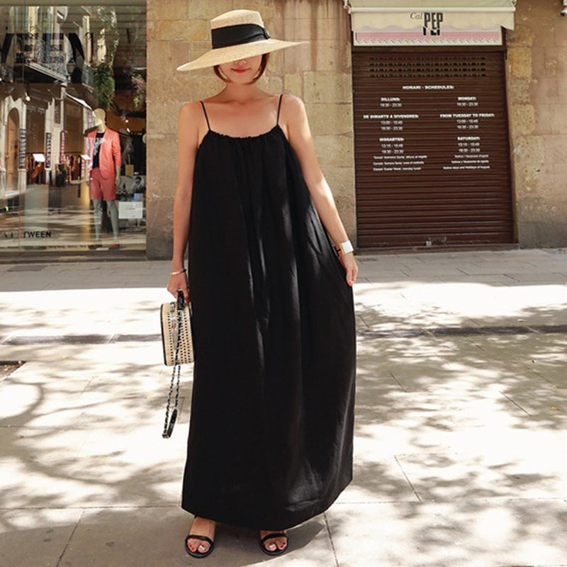 新款吊带棉麻连衣裙女过膝长款韩版宽松大码背心裹胸露背亚麻裙子