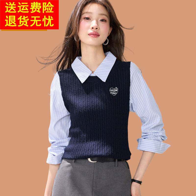 羊毛衫毛衣女款2026新款春季高级衬衫领假两件上衣时尚洋气配裙子