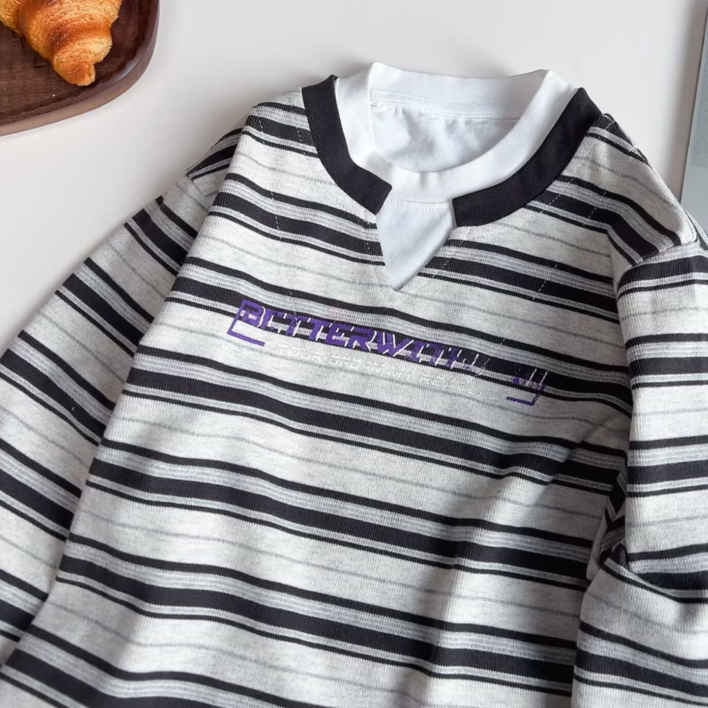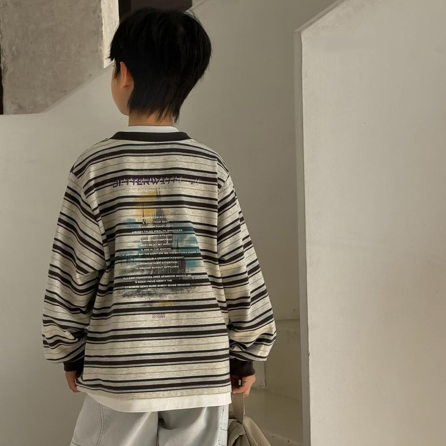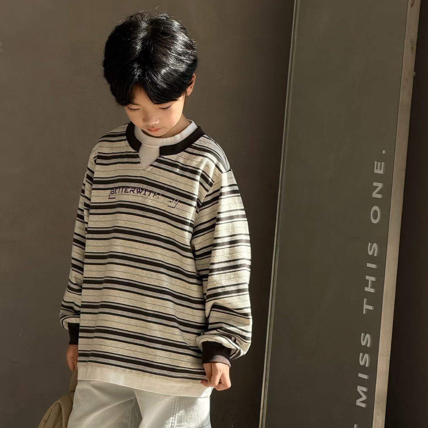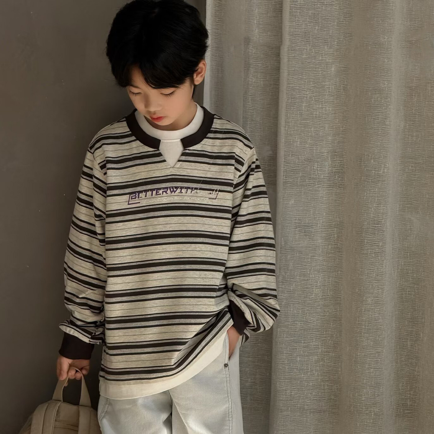 大E小e童装男女童双领假两件T恤2026春款中大童条纹儿童卫衣26037