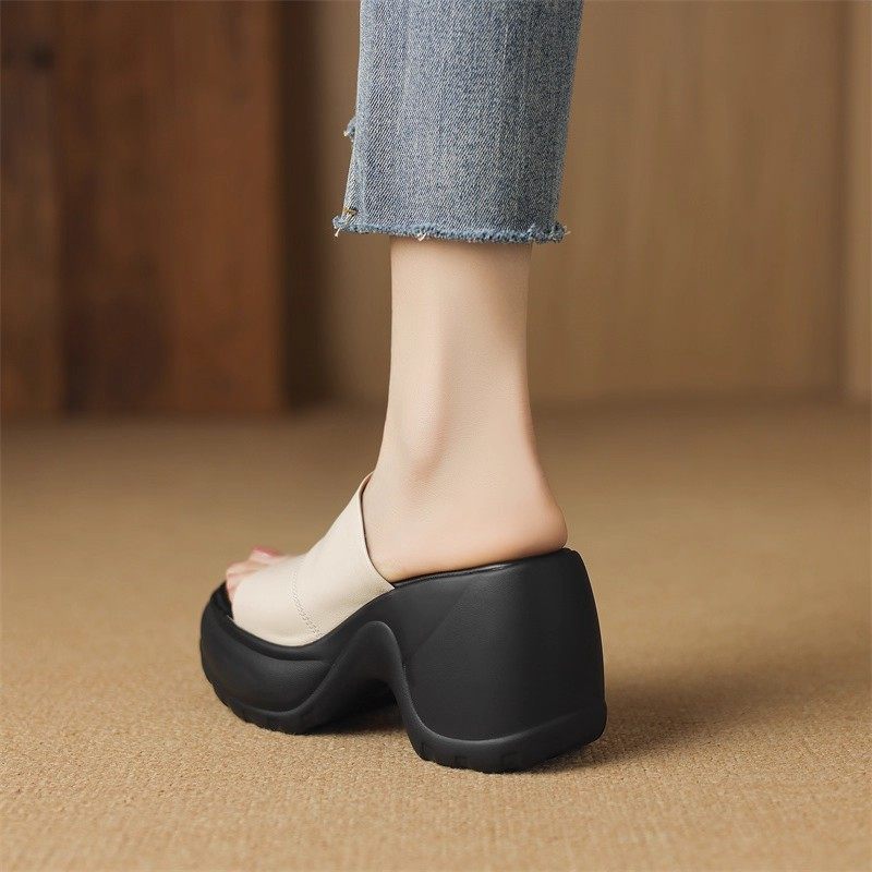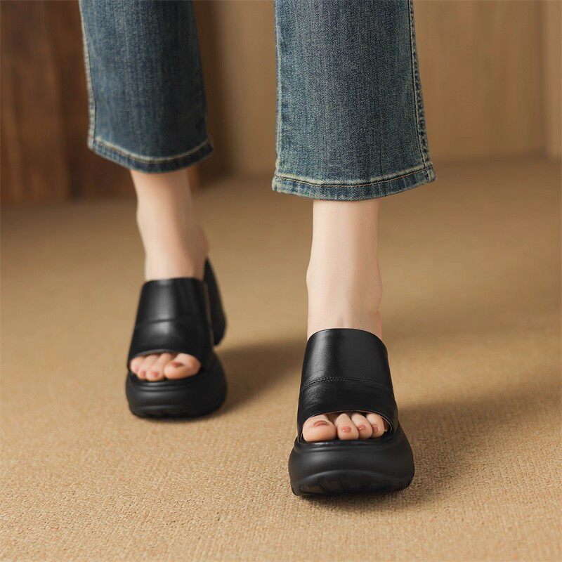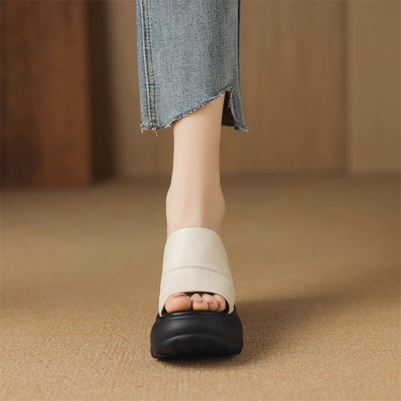 10cm厚底凉拖鞋女外穿2025年夏季新款松糕一字真皮小个子增高凉鞋