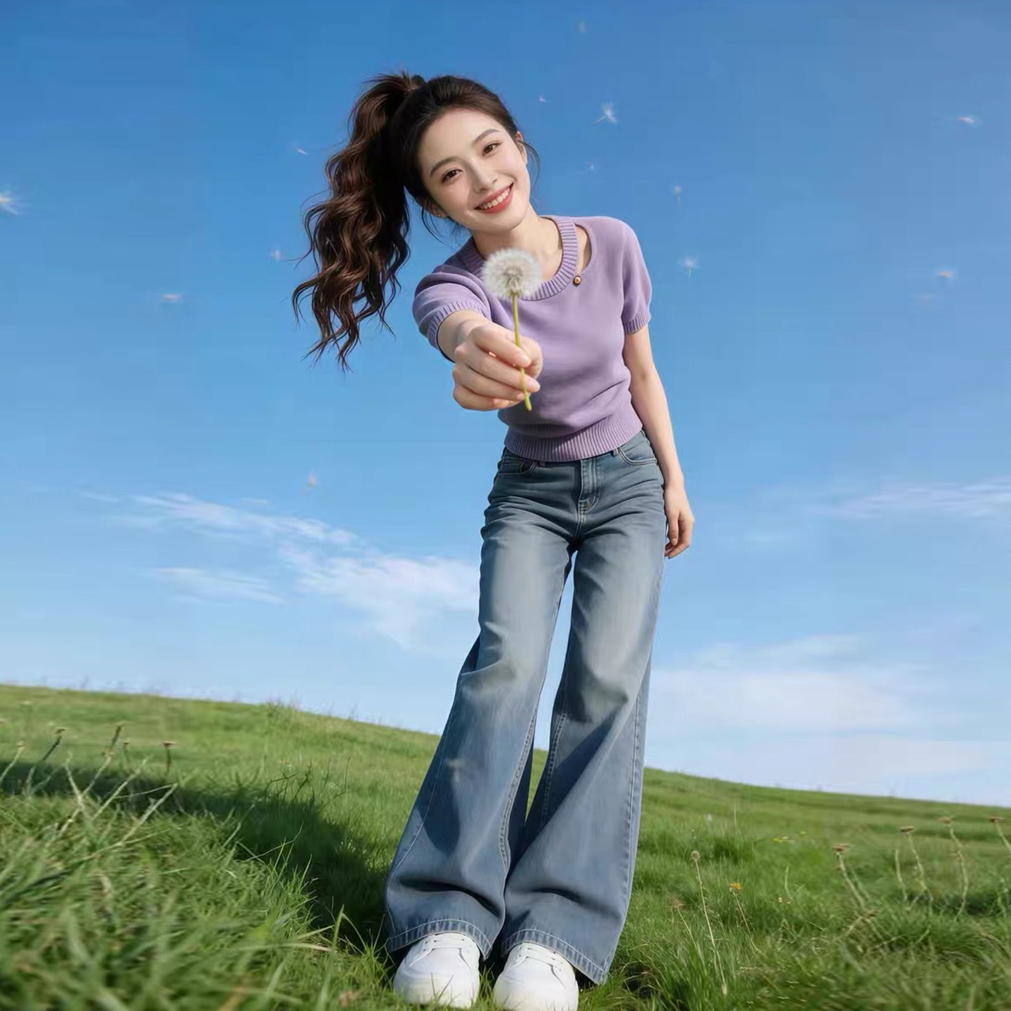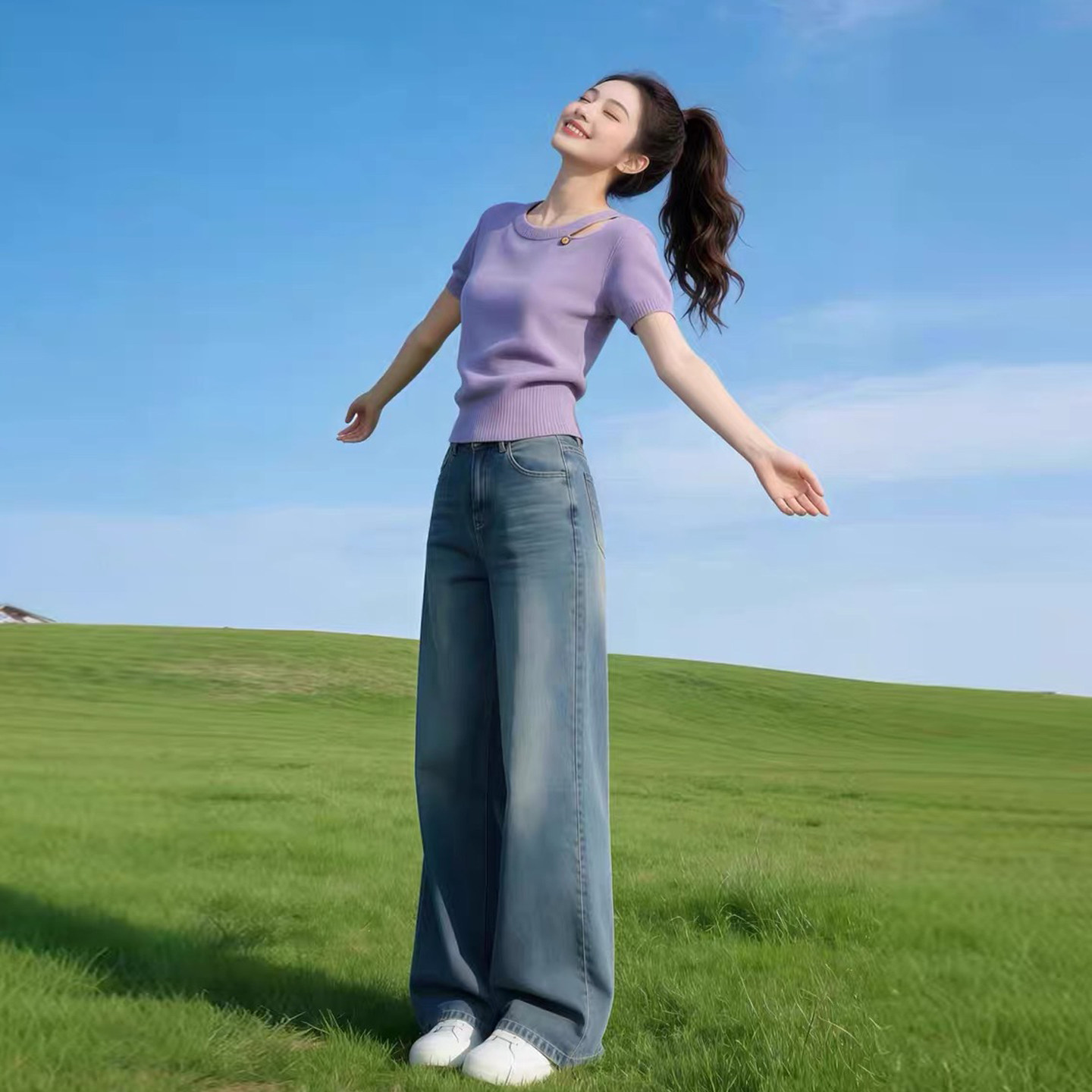 好看的韩式穿搭一整套2026夏新款针织衫上衣阔腿牛仔裤子两件套装