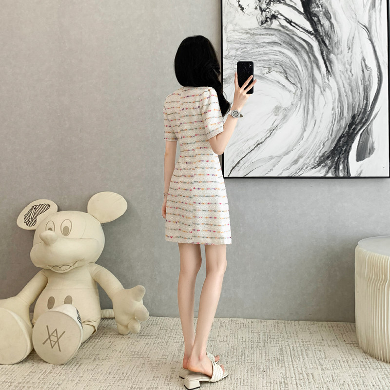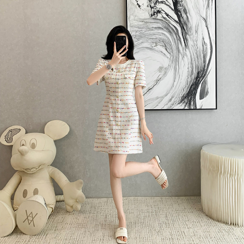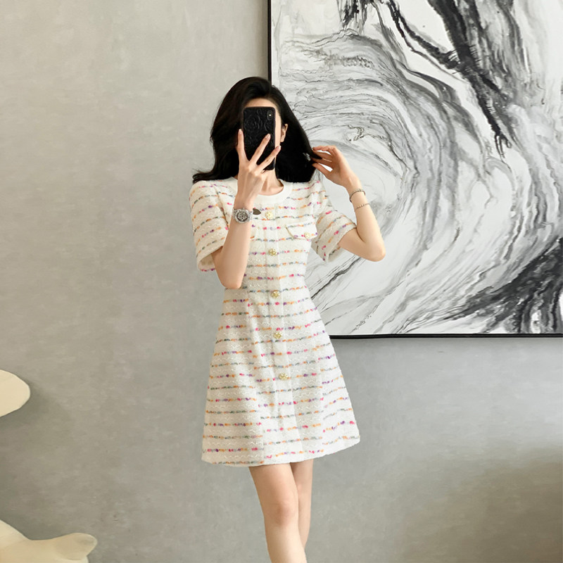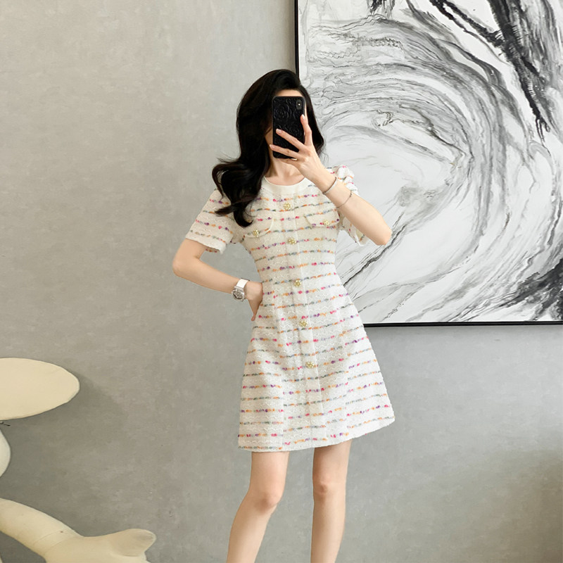 法式小香风短袖连衣裙女夏季新款气质修身显瘦减龄a字裙子小个子