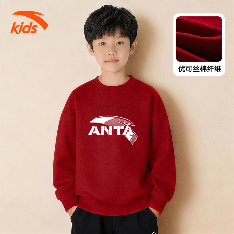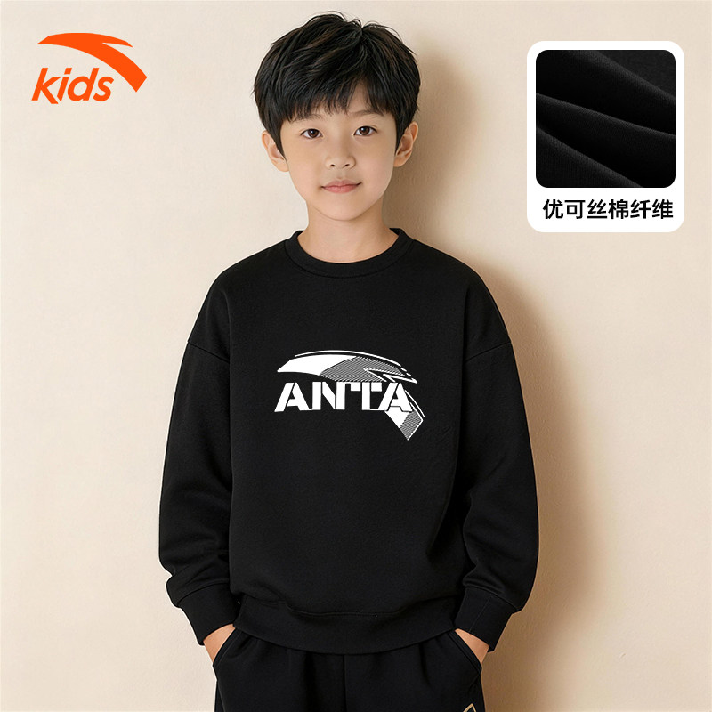 安踏儿童卫衣男孩2026春季新款棉质面料圆领长袖t恤女套头衫男童