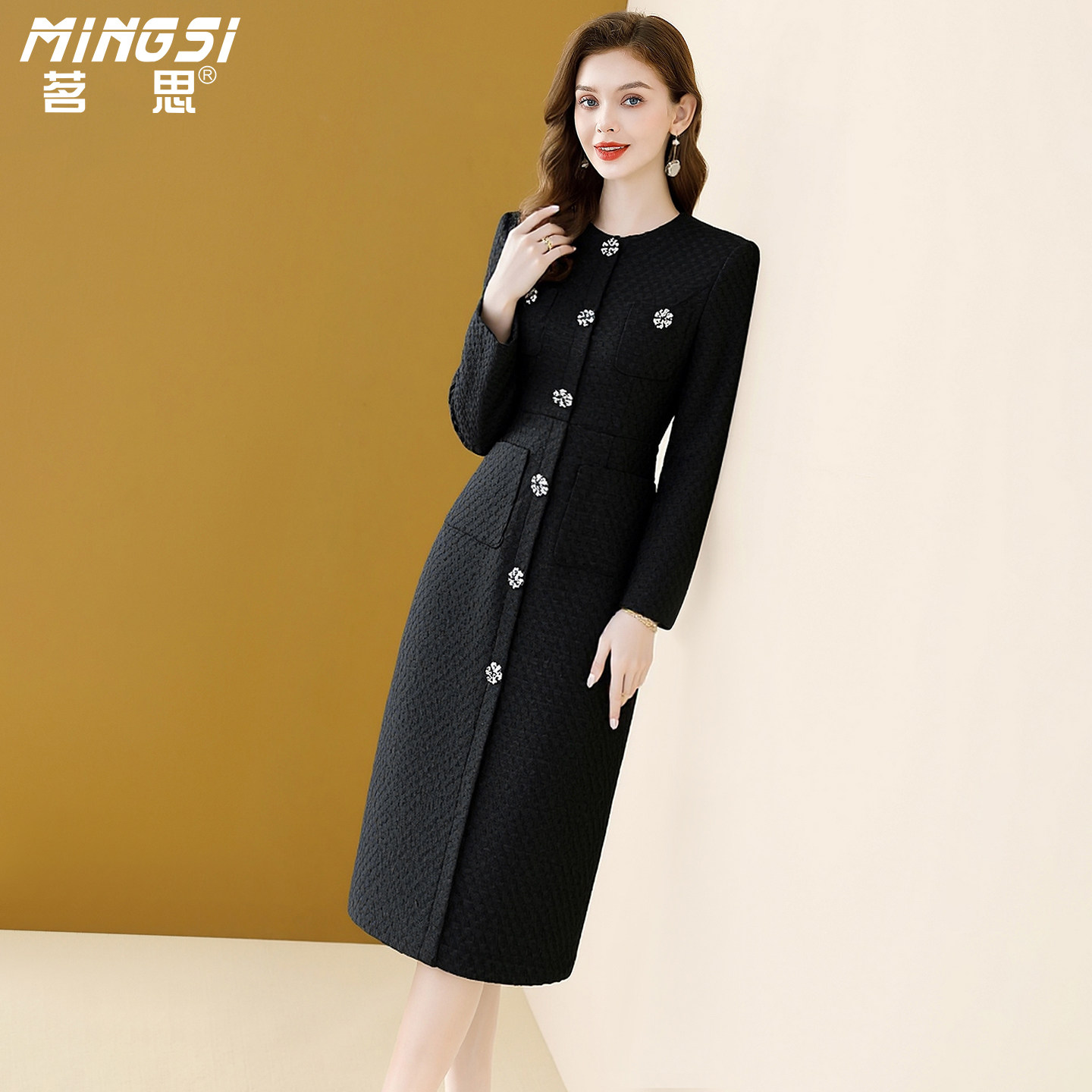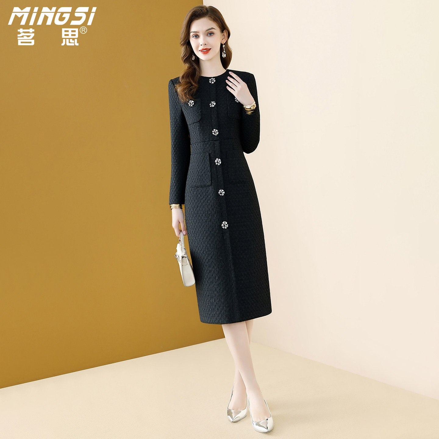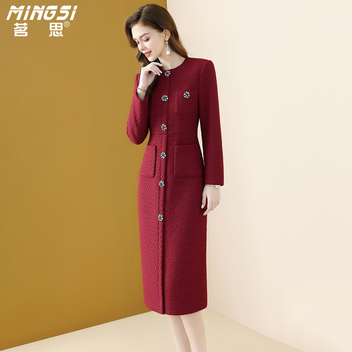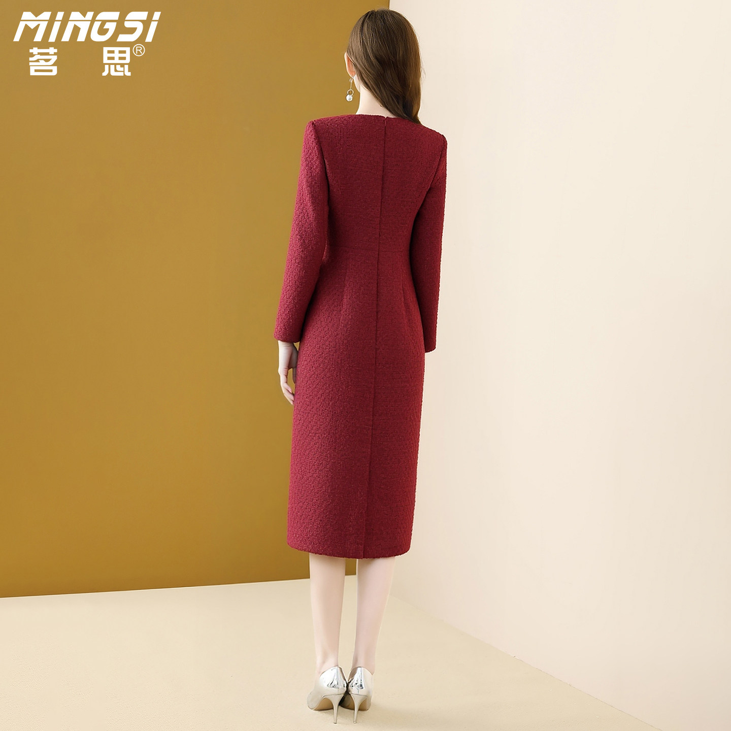 茗思红色小香风连衣裙女2025冬季新款内搭包臀收腰显瘦粗花呢裙子