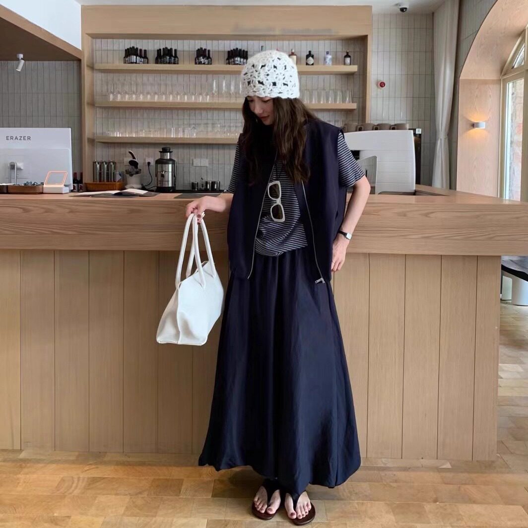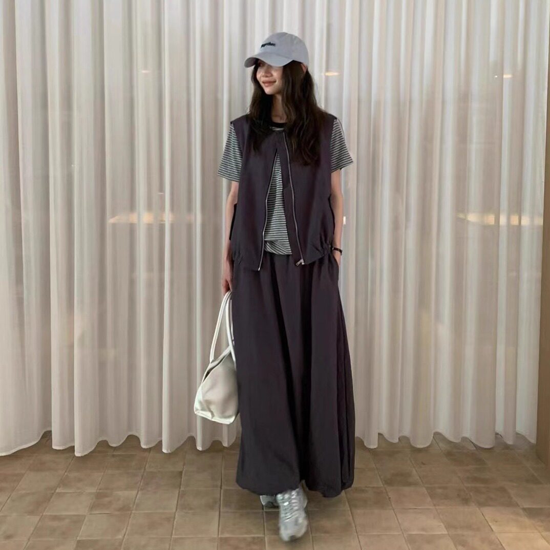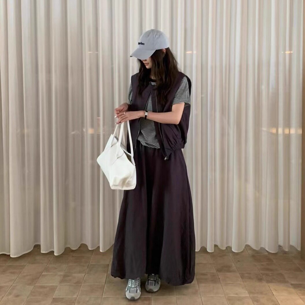 QIXI柒熹新款时尚百搭宽松显瘦无袖花苞背心马甲半身裙三件套装女