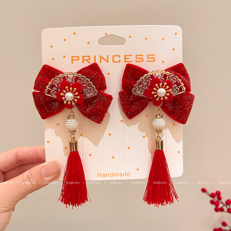 新年红色儿童喜庆发夹蝴蝶结过年发饰古风头饰中国风女童汉服发卡