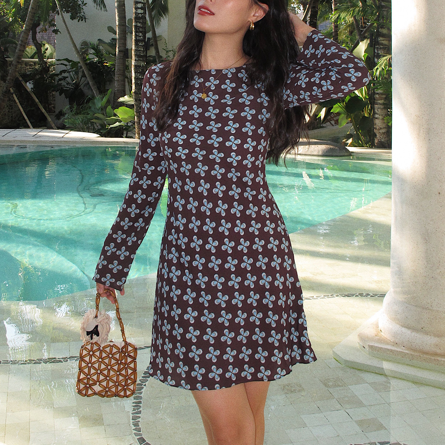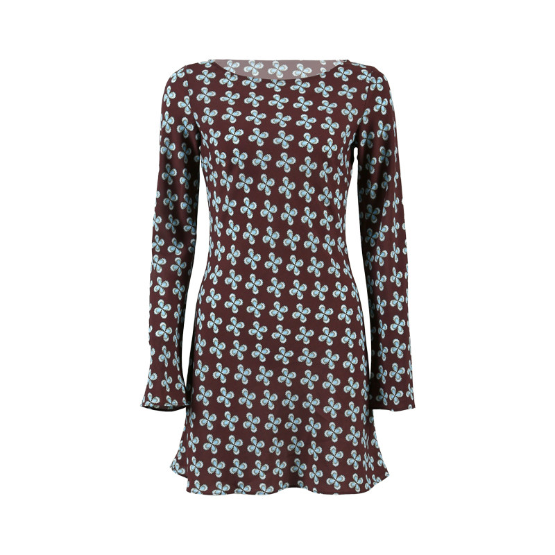 ooh itch痒痒 法式复古印花连衣裙长袖修身显瘦基础款a字短款裙子