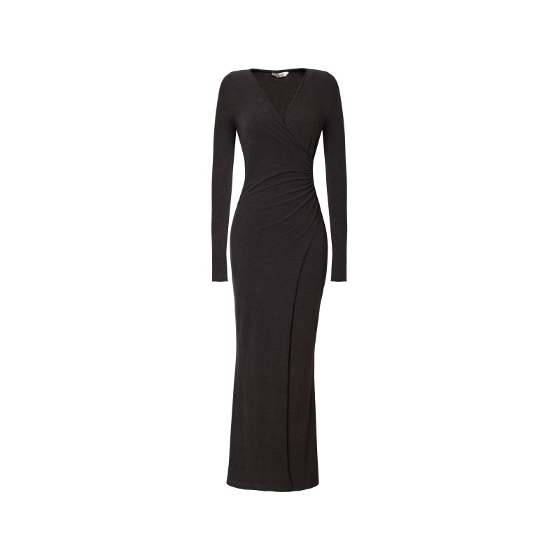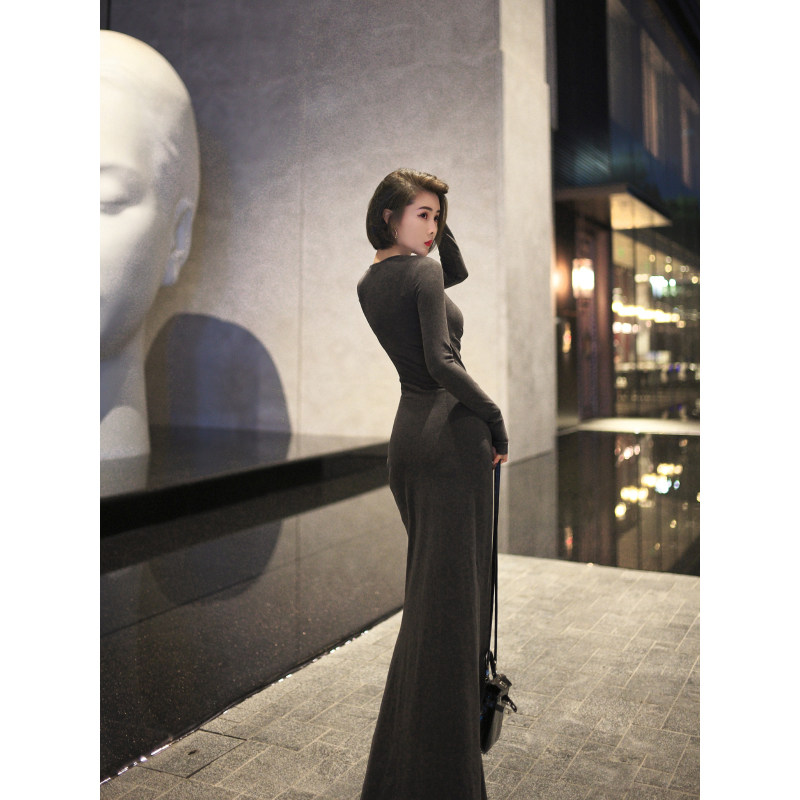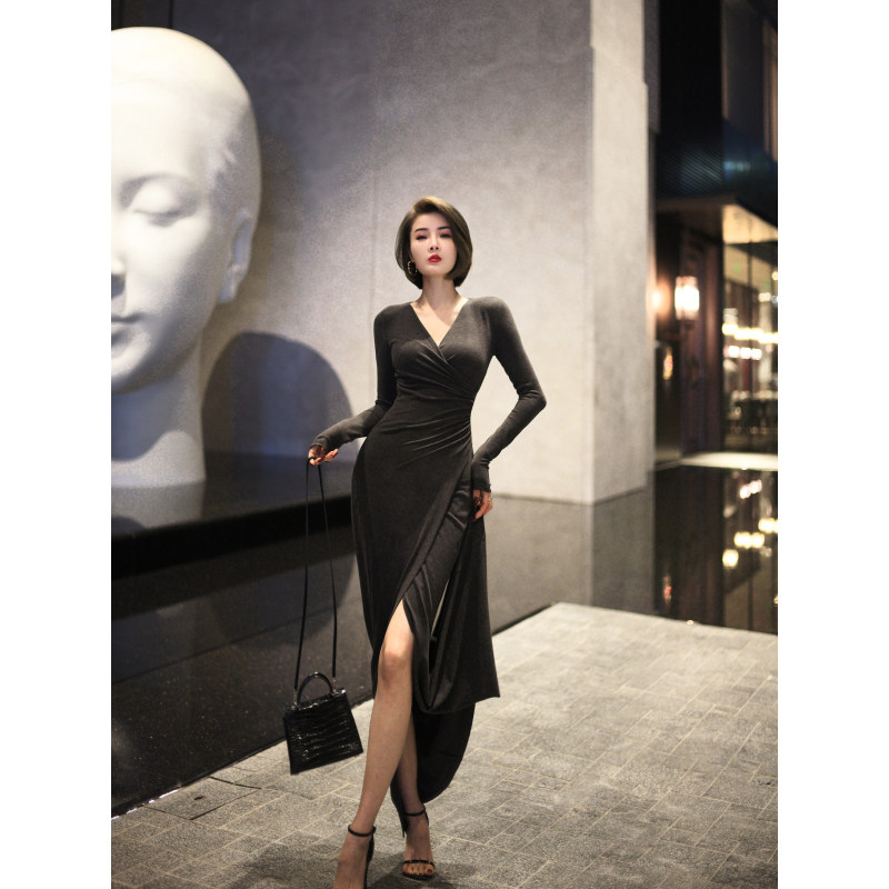 XULU原创简约纯色慕斯绒气质百搭休闲复古优雅褶皱长袖V领连衣裙
