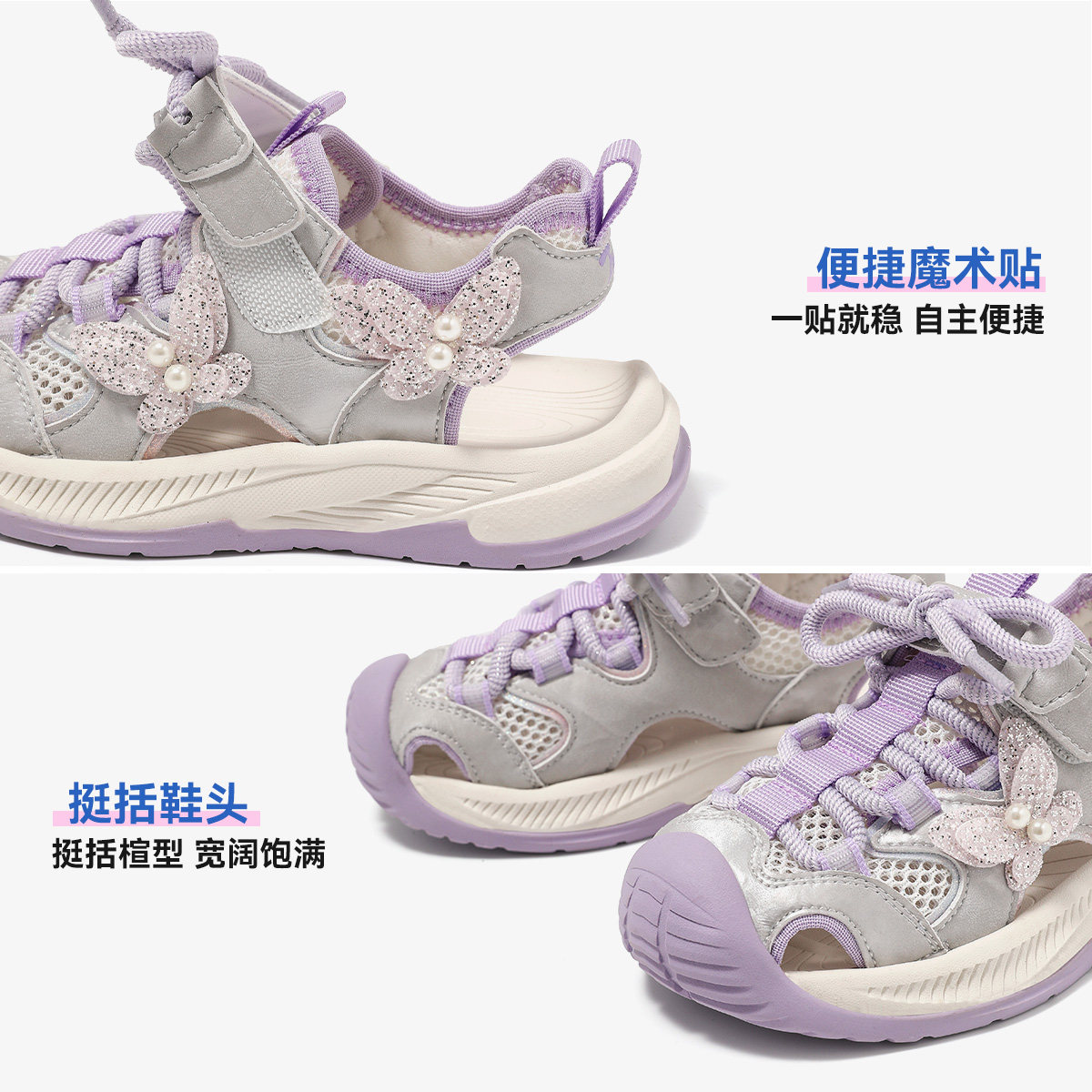 天美意童鞋2026儿童包头凉鞋女童运动风蝴蝶结系带溯溪鞋夏季新款