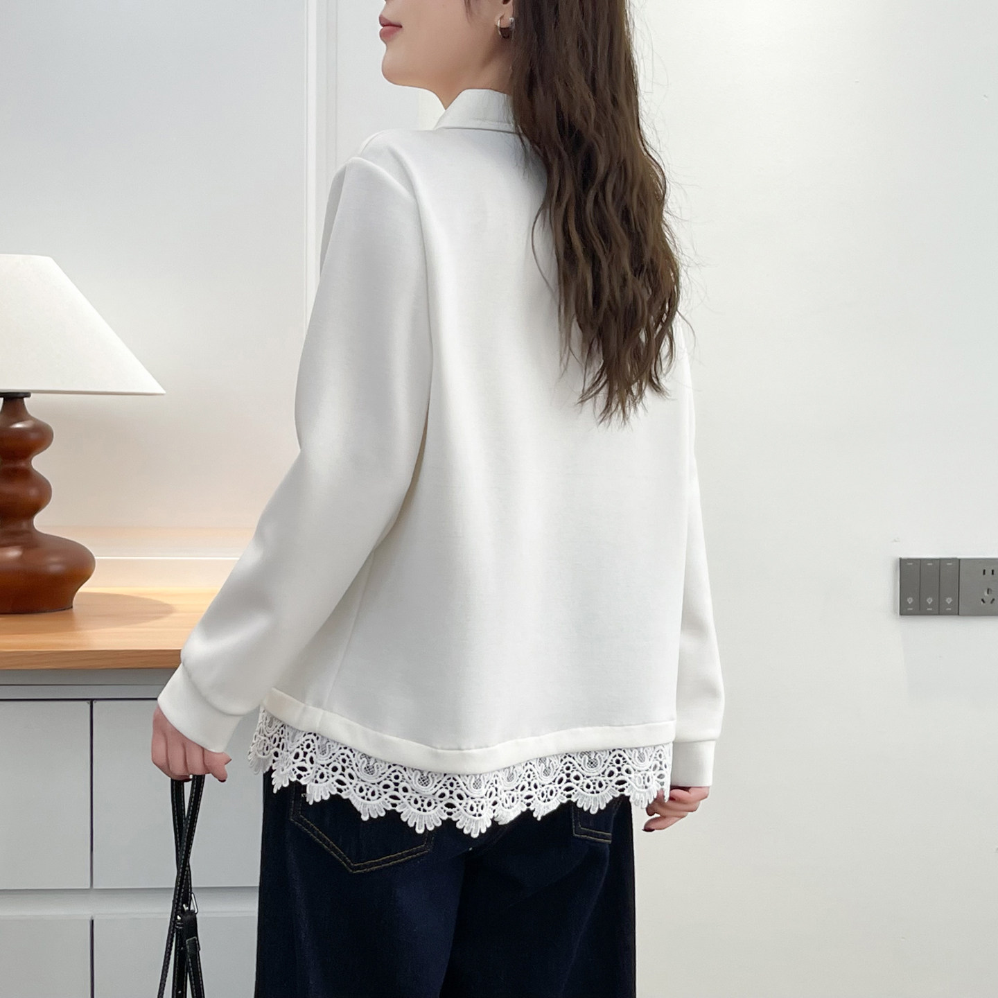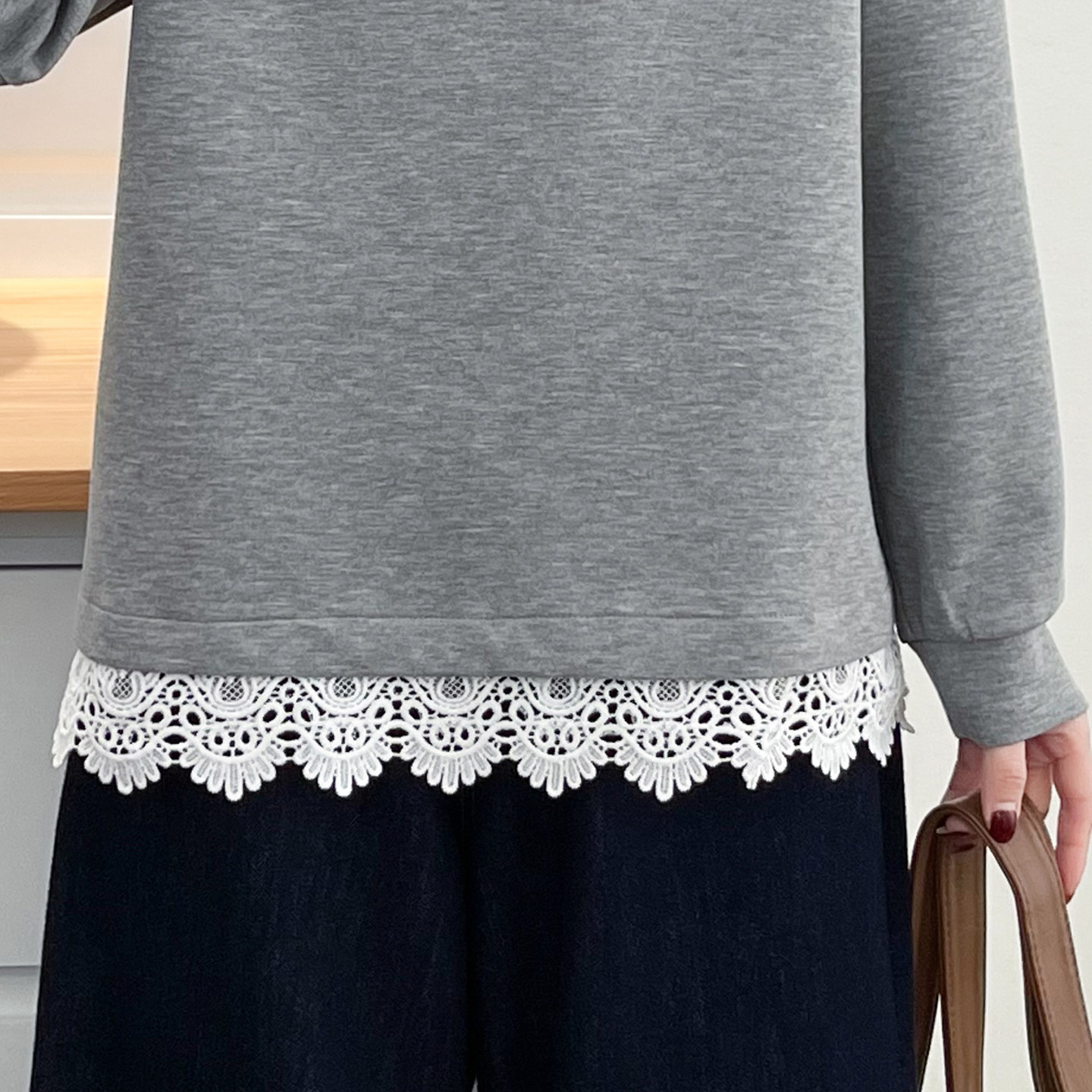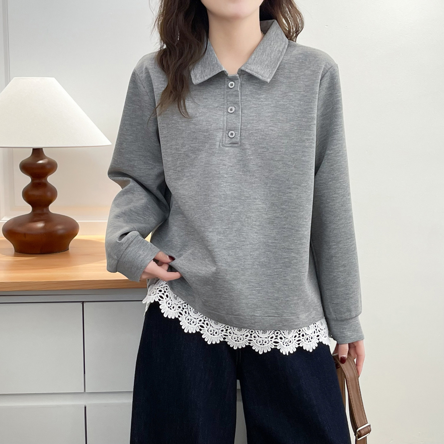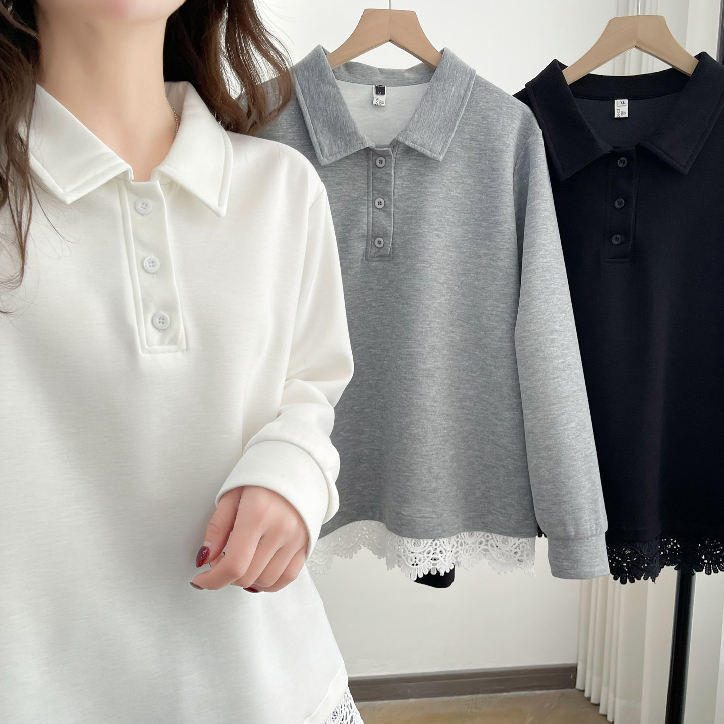 长袖t恤女大码正肩遮肚子2026春季新款200斤时尚蕾丝拼接翻领上衣