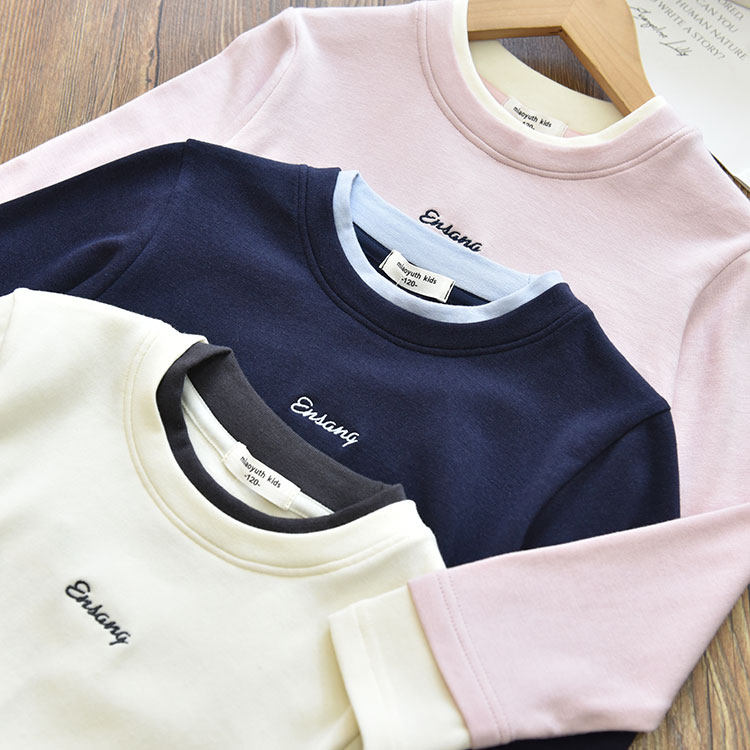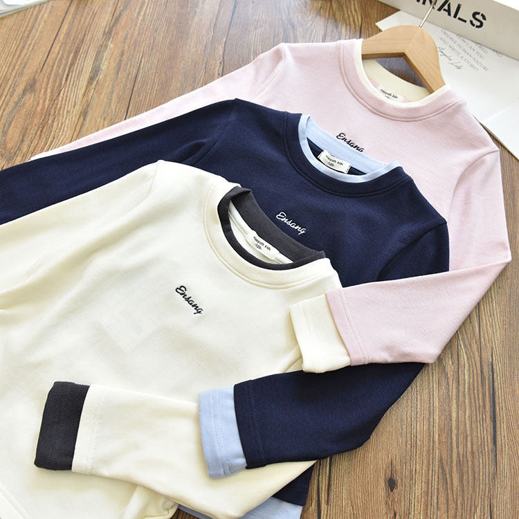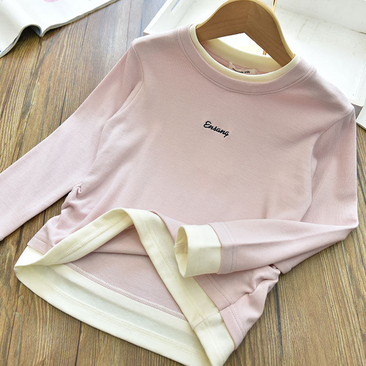 女童软糯亲肤假两件拼色字母长袖打底衫 中大儿童内搭T恤上衣秋