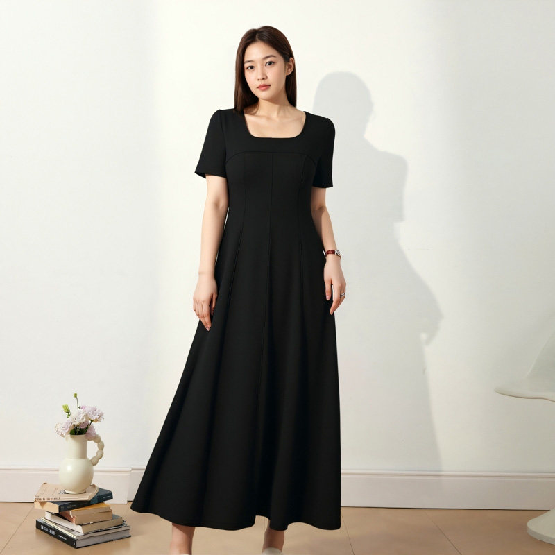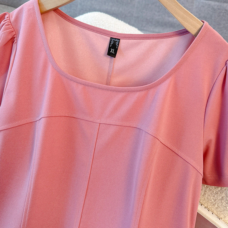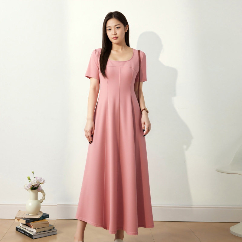 连衣裙女大码胖mm梨型身材3D版型收腰遮肚子巨显瘦粉色A字裙长裙