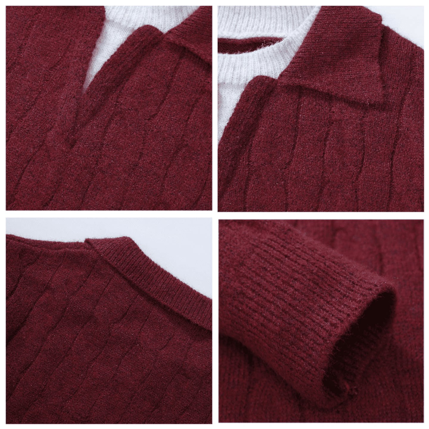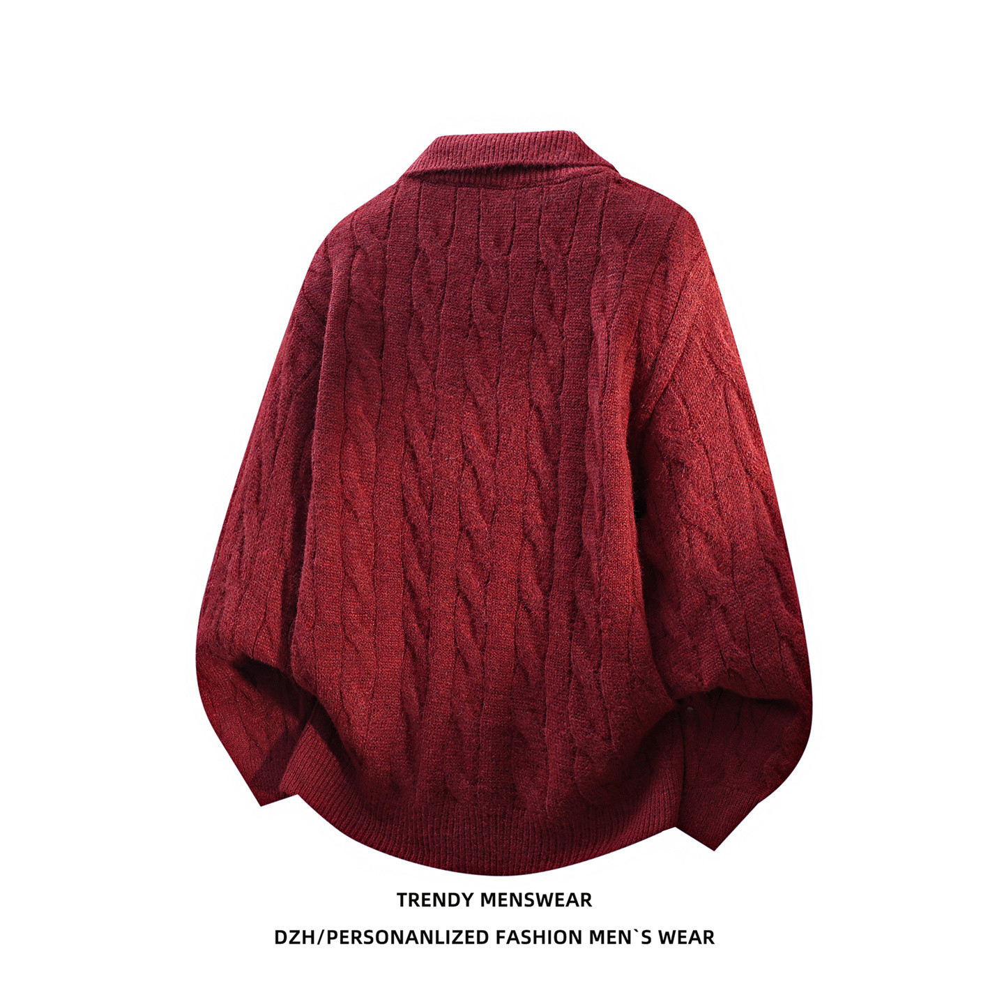 男士新年圣诞红色毛衣冬季男新款假两件拼接上衣翻领针织衫男款冬