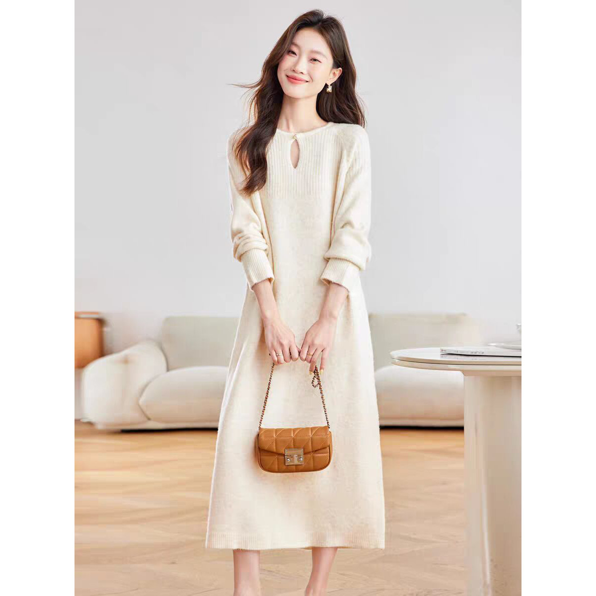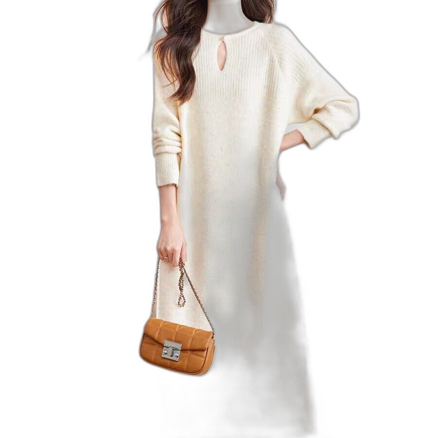 2025秋冬新款圆领宽松慵懒风中长款针织连衣裙女遮肚子毛衣打底裙