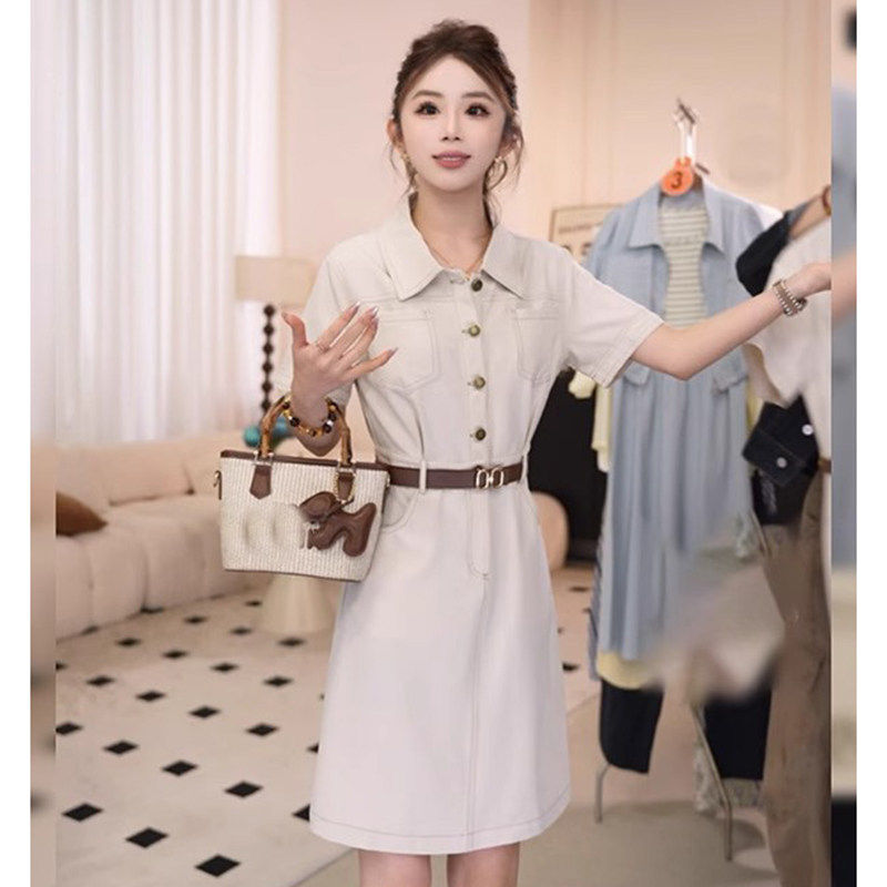 送腰带2026夏季新款女日常通勤风收腰显瘦短袖翻领连衣裙D1632