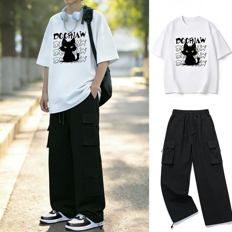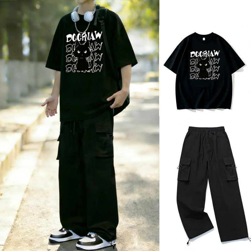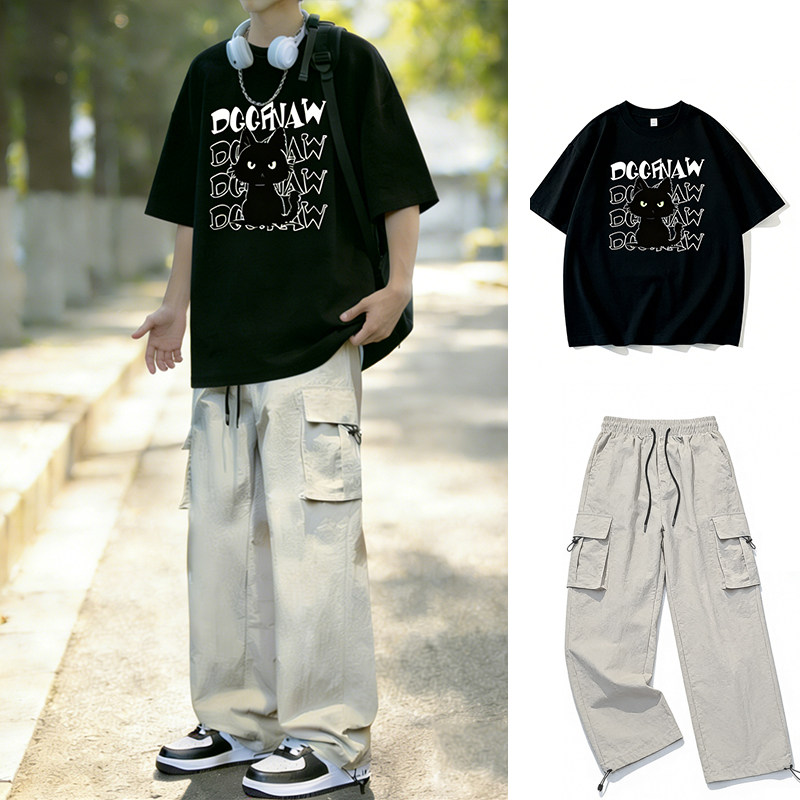 青少年纯棉短袖T恤套装男初高中学生夏季帅气潮流运动穿搭两件套