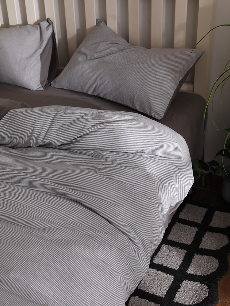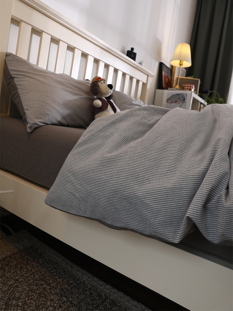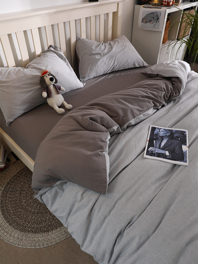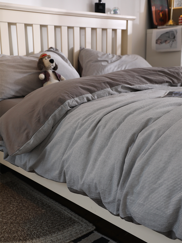 简约北欧日系全棉水洗棉细条灰100纯棉四件套男生耐脏学生宿舍1.8