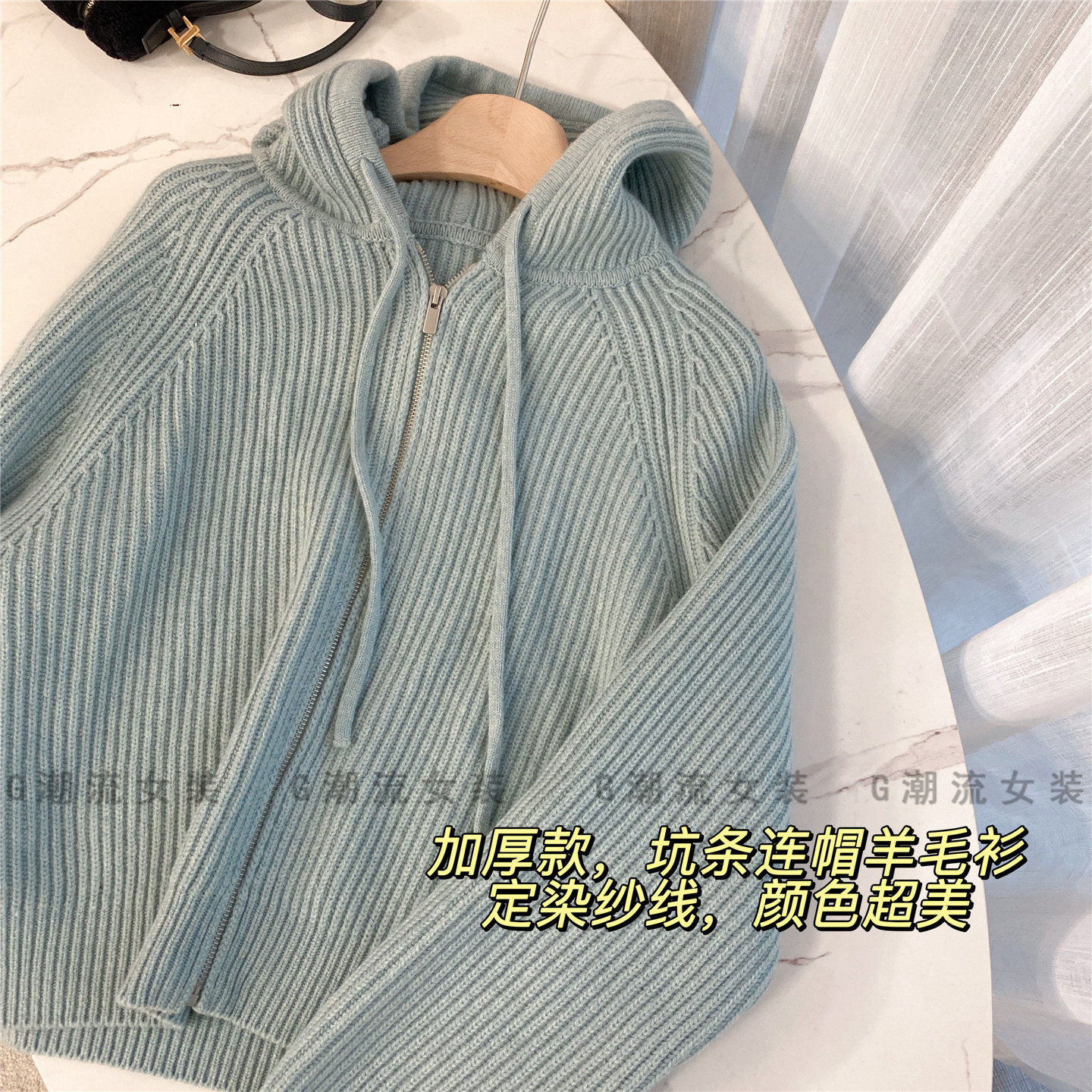 定染蓝色减龄显白加厚坑条纹理拉链连帽绵羊毛毛衣外套女秋冬短款