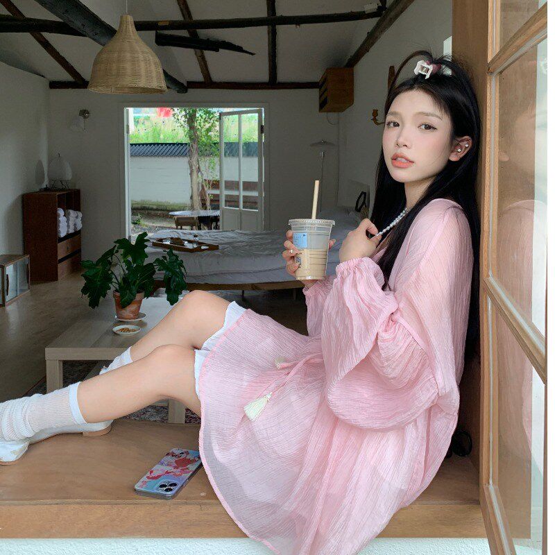 大码春夏季微胖妹妹mm宽松设计感小众泡泡袖V领系带长袖连衣裙女